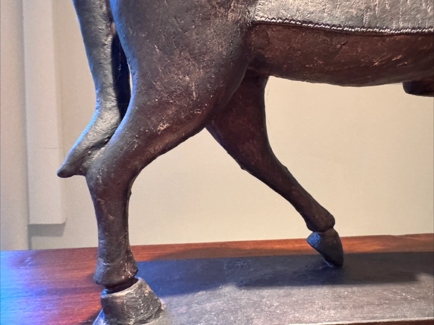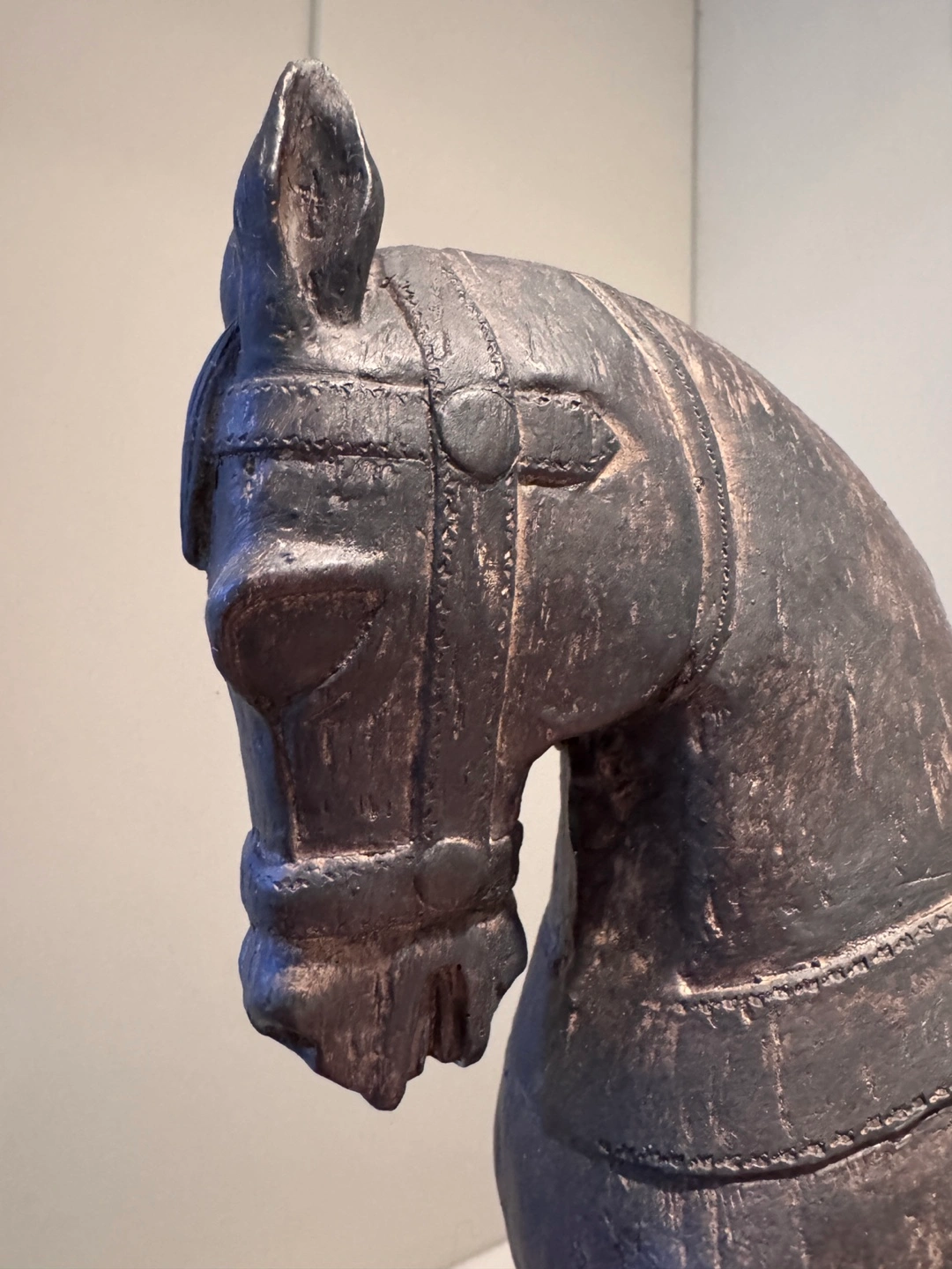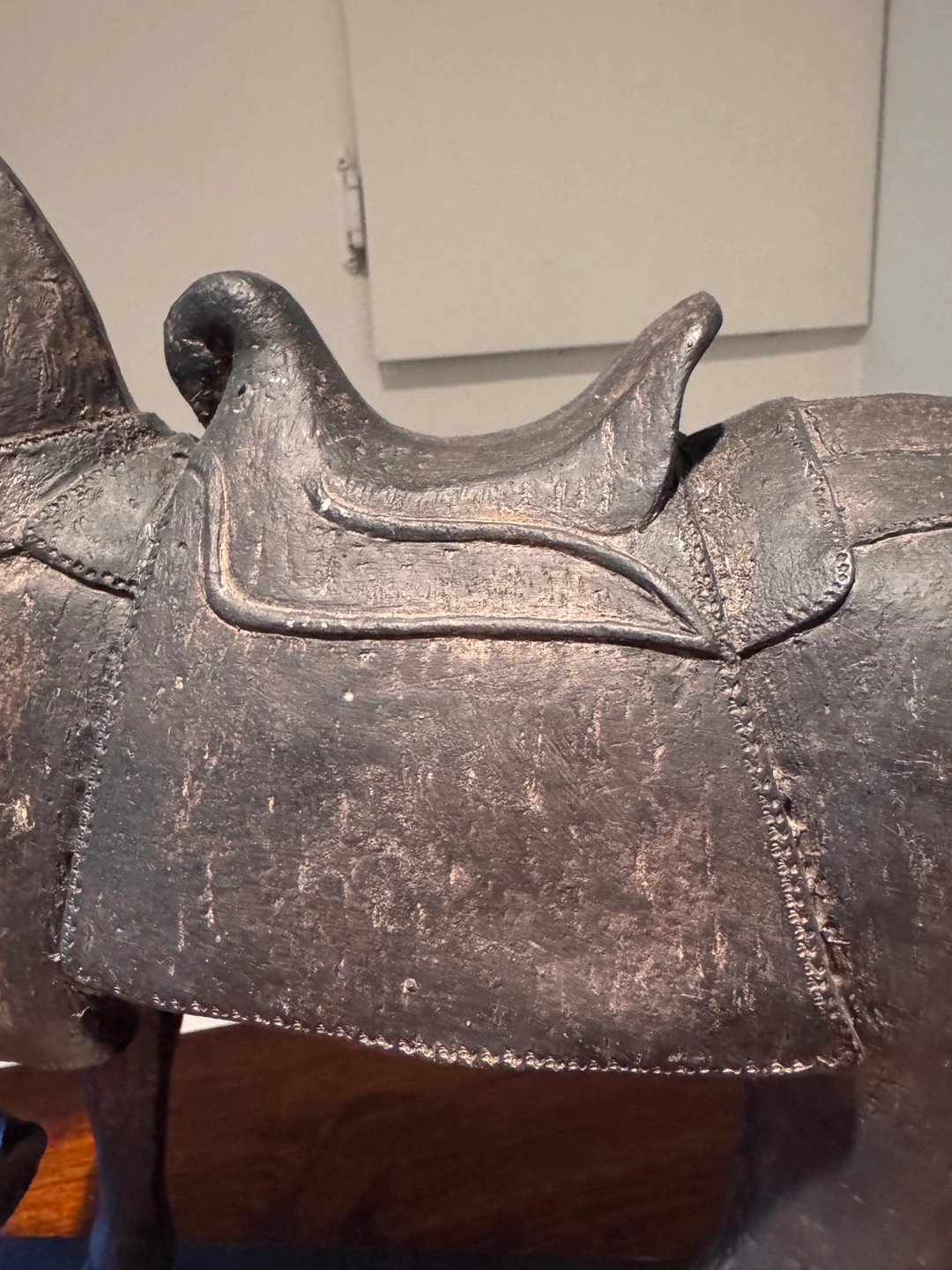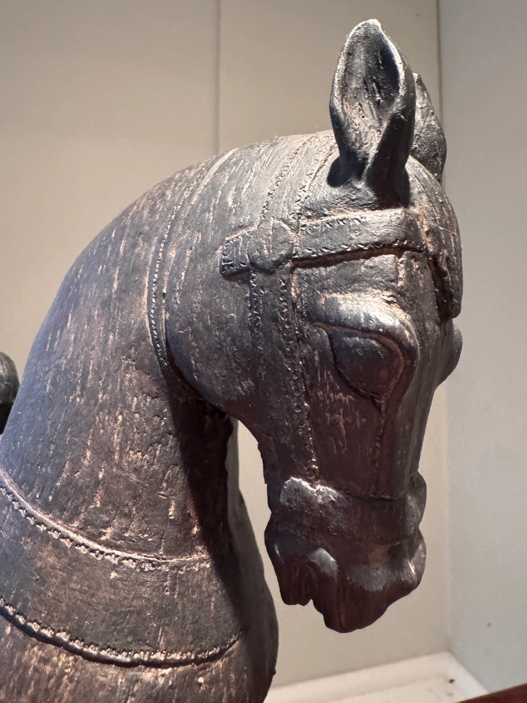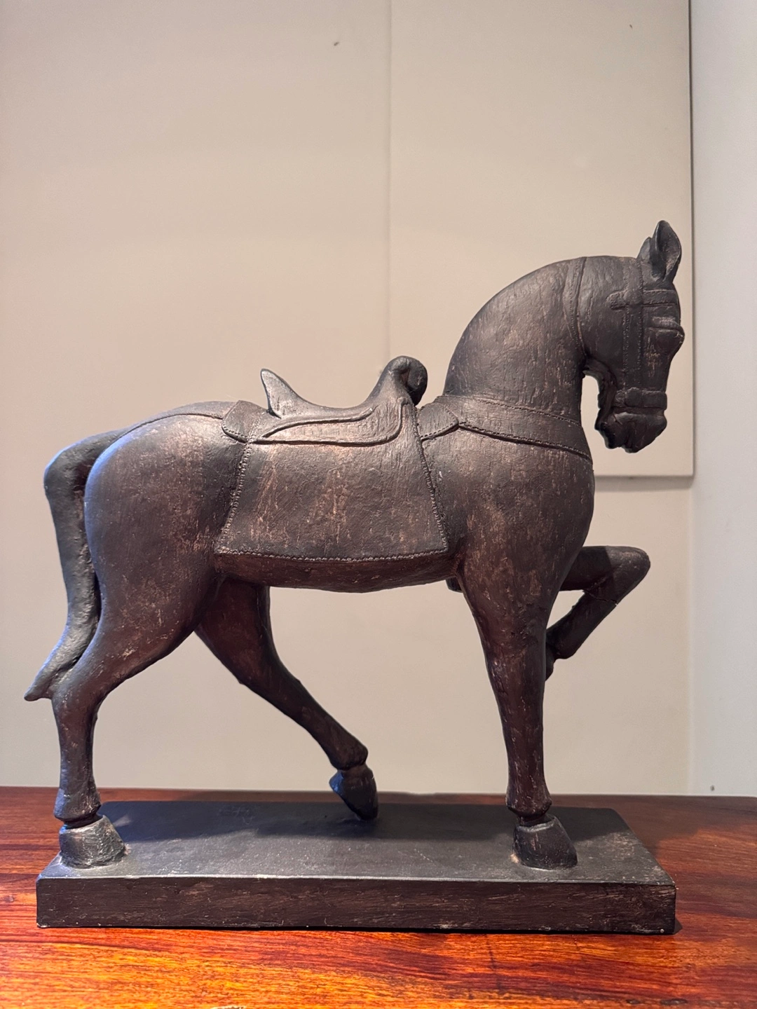 This Ebon sculpture captures the grace and strength of a horse in motion, with meticulous attention to anatomical detail. Features a saddle, rests on a dark brown rectangular base. Its dark finish and elegant stance make it a striking addition to any art collection. Collectible figurine