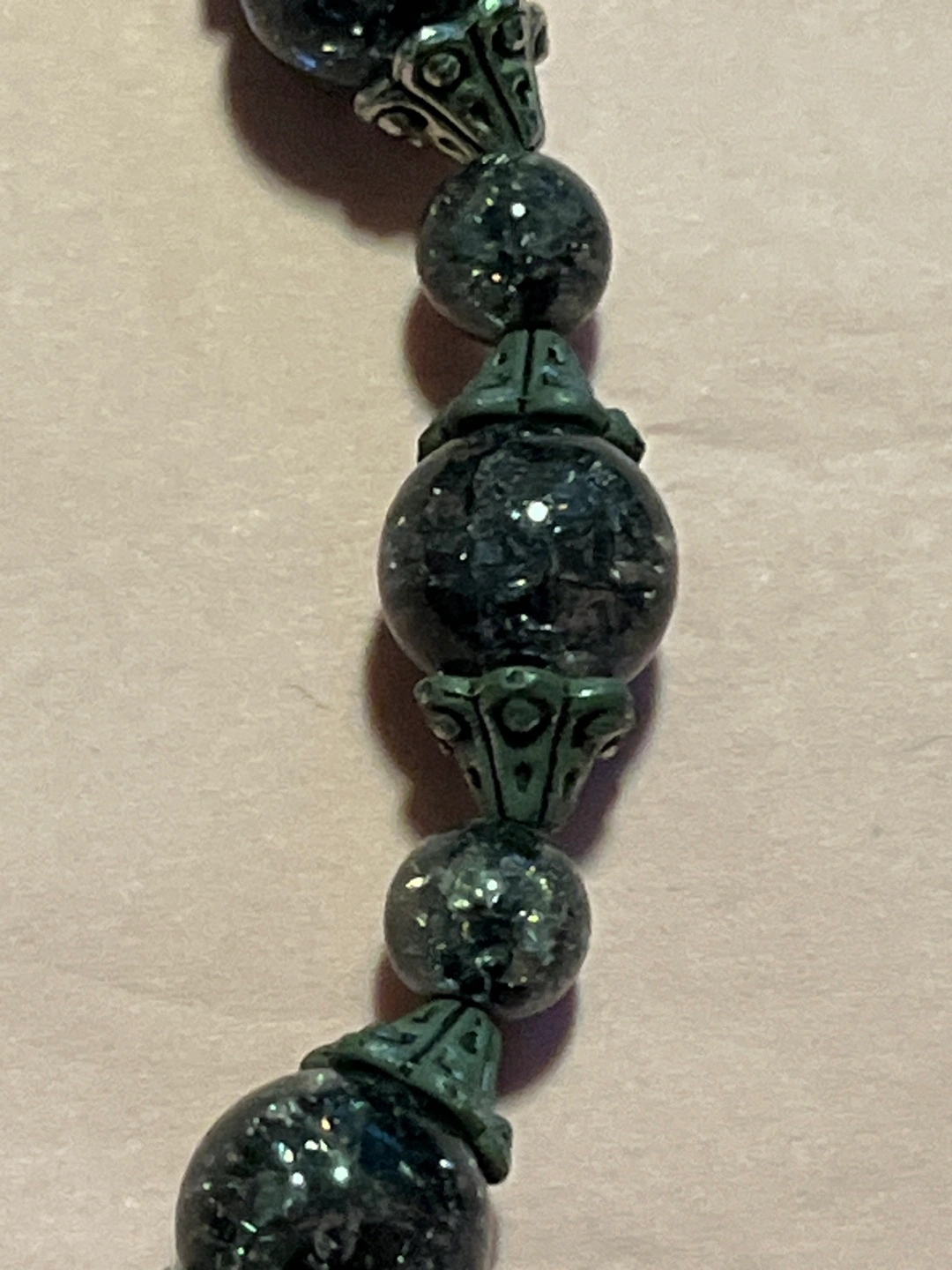 Here's a beaded bracelet with a black and silver colour scheme. It's in great condition and would be a lovely addition to any outfit!