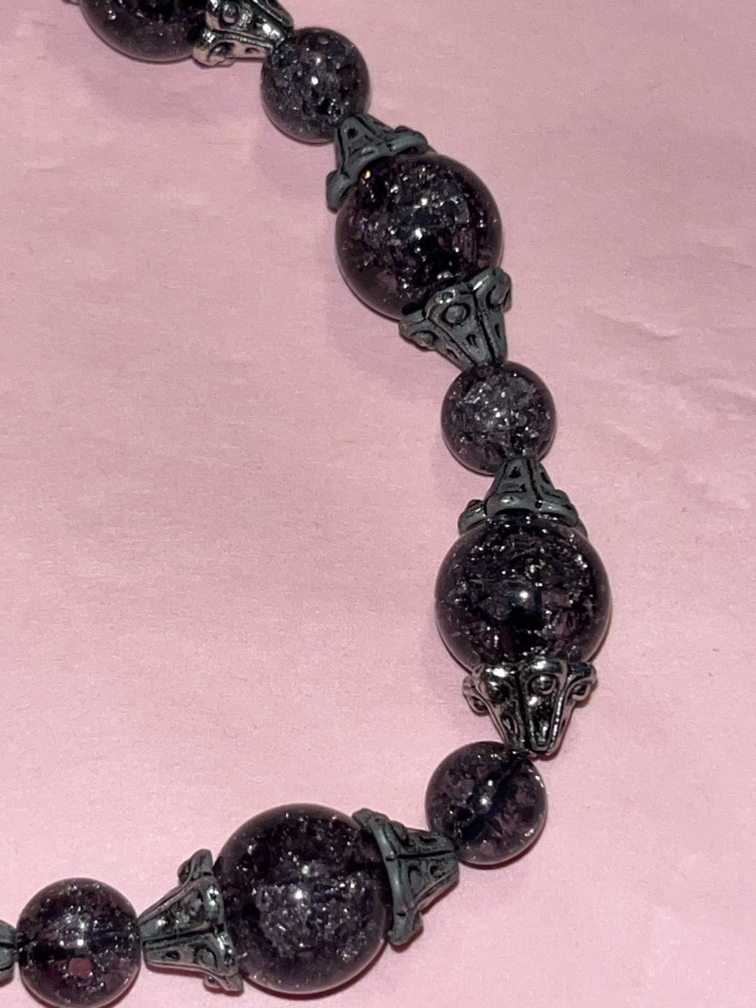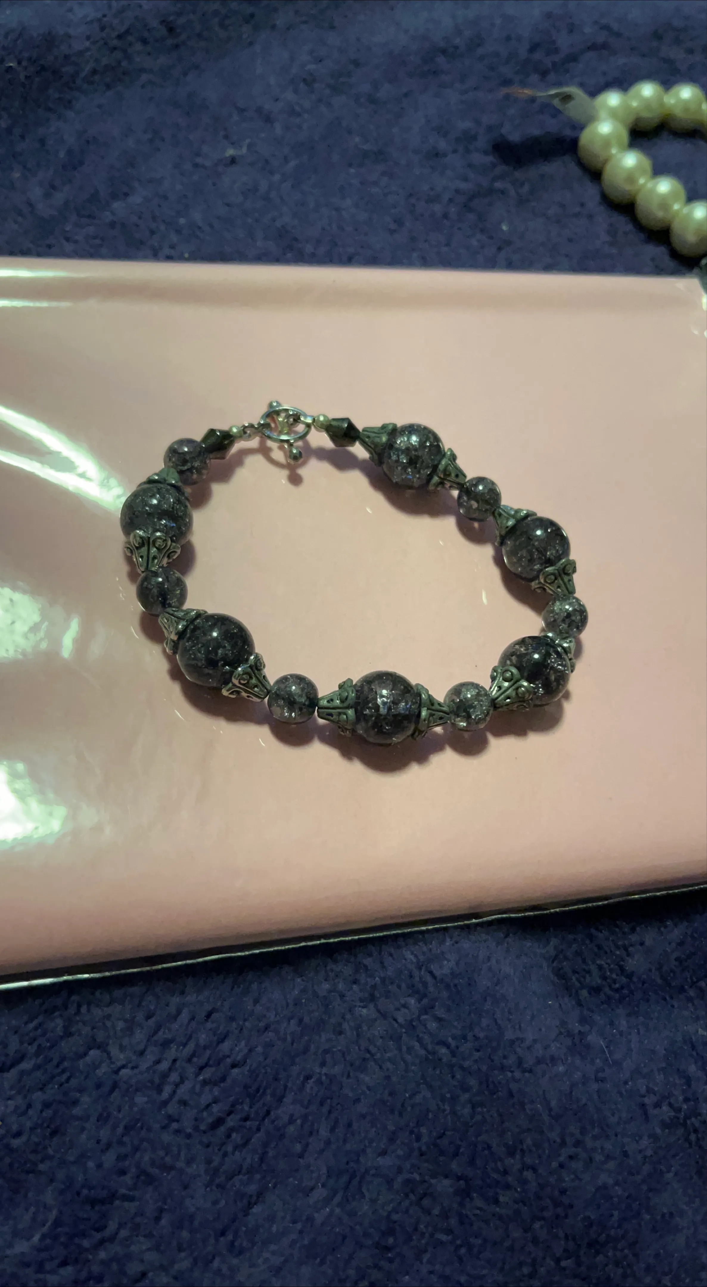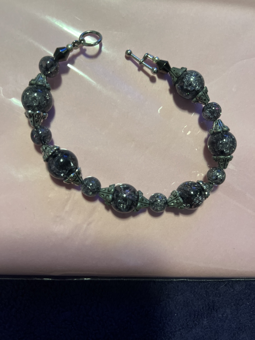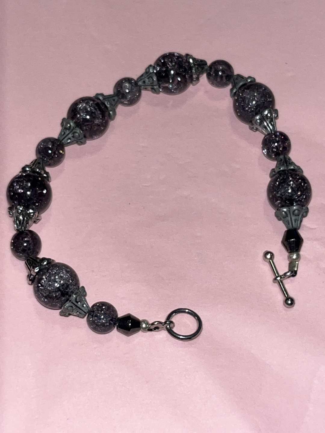 Here's a beaded bracelet with a black and silver colour scheme. It's in great condition and would be a lovely addition to any outfit!
