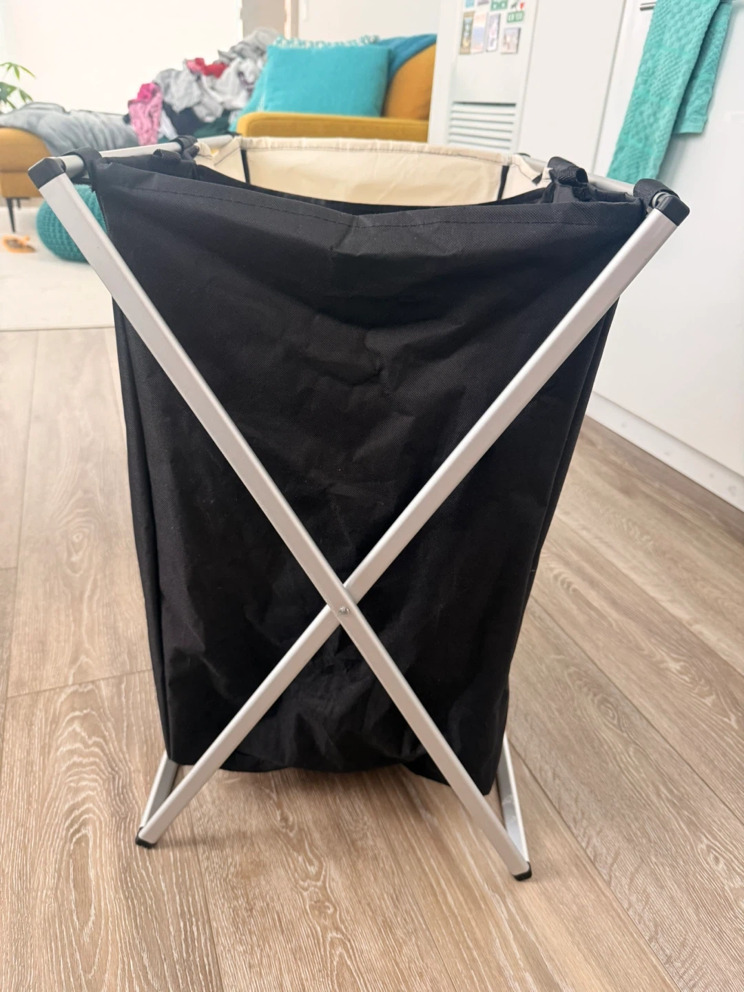 This laundry hamper features two separate compartments, one labelled 'DARKS' and the other 'LIGHTS'. It's made with a fabric interior and a metal frame for stability. Handles make it easy to carry.