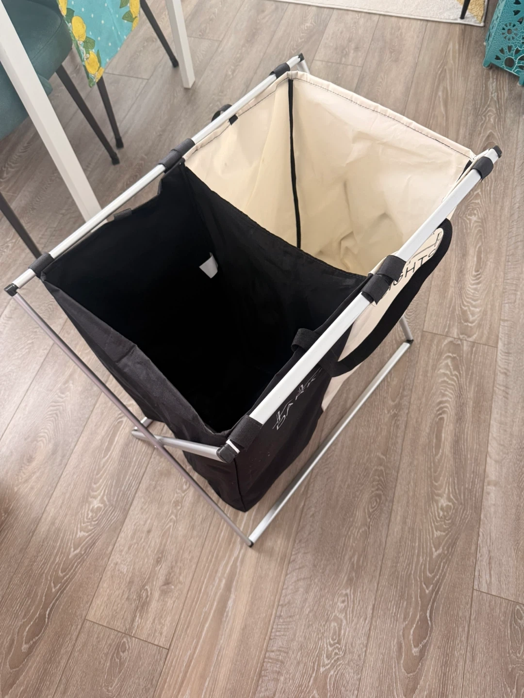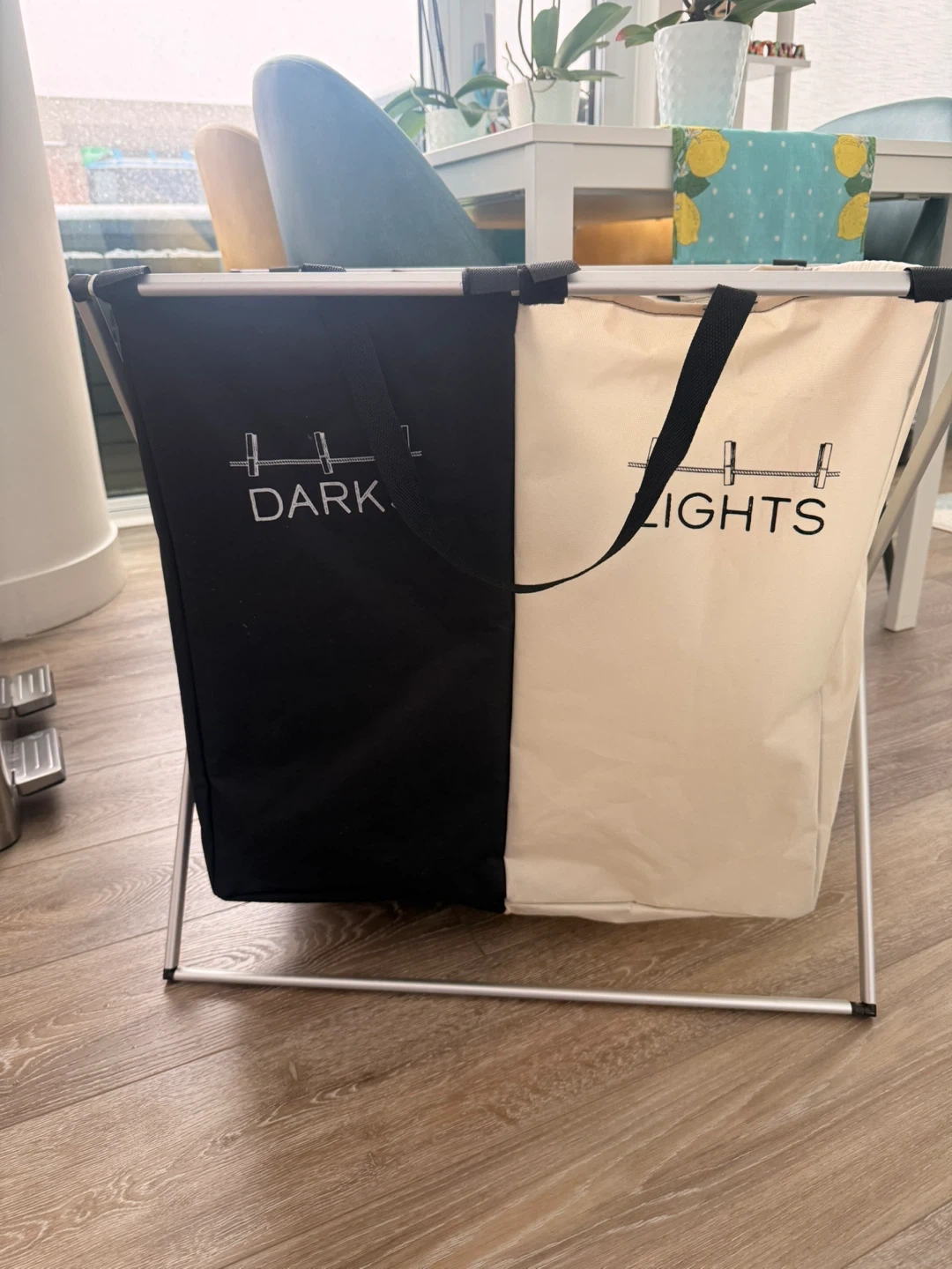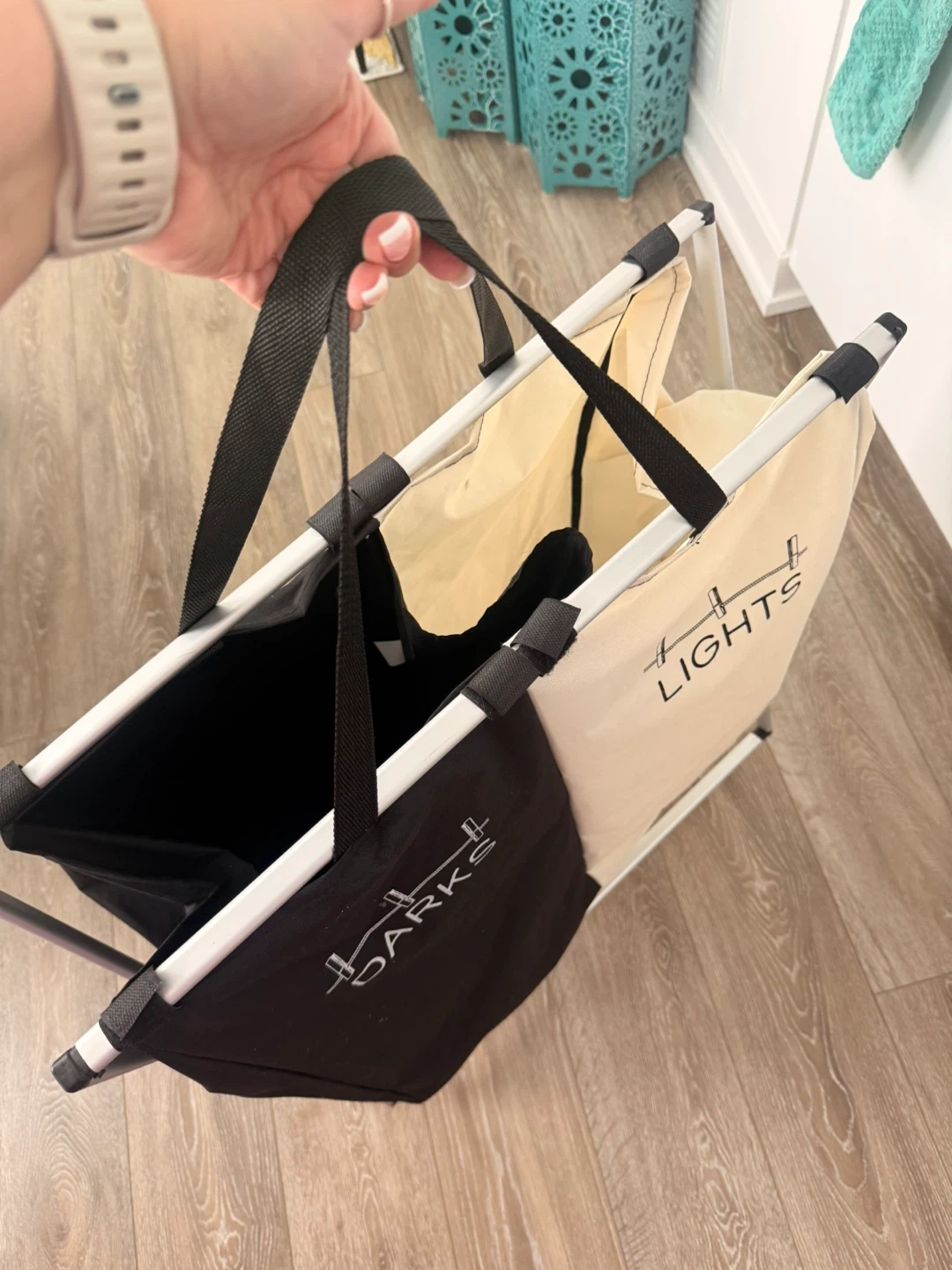 This laundry hamper features two separate compartments, one labelled 'DARKS' and the other 'LIGHTS'. It's made with a fabric interior and a metal frame for stability. Handles make it easy to carry.