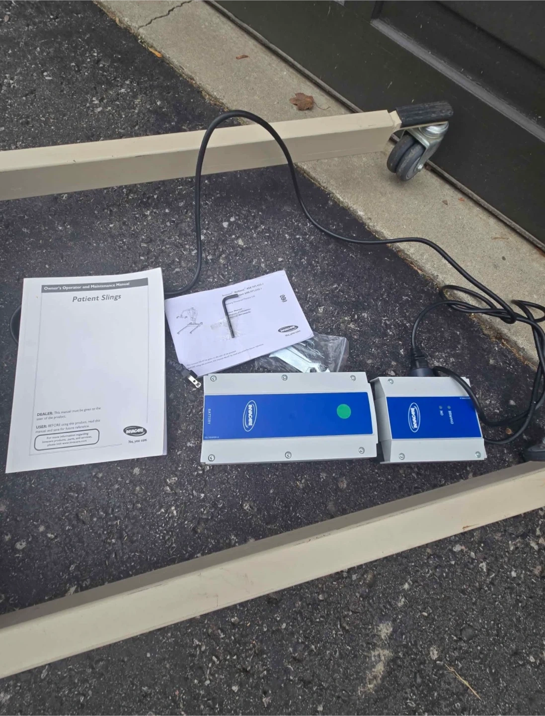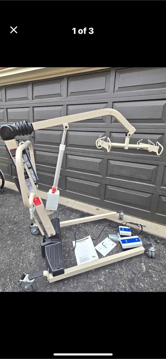 Invacare patient lift with two battery units. This lift is designed for safe patient transfers. It has a weight capacity of 450 lbs. Ask about hoyer slings if you require them.