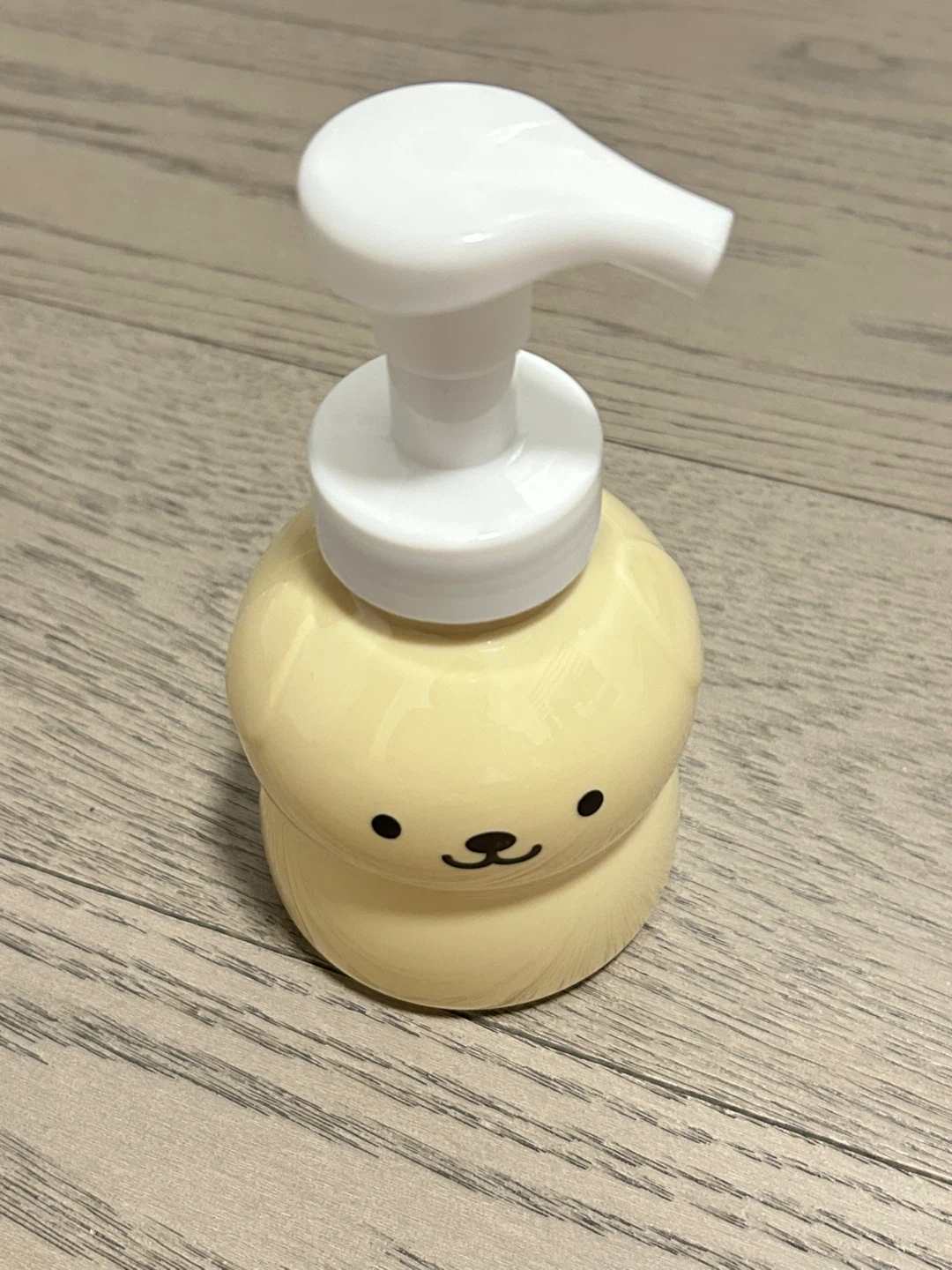 This is a cute yellow bear-shaped pump bottle. It's great for dispensing soap or lotion. The bottle is made of plastic and features a white pump dispenser.