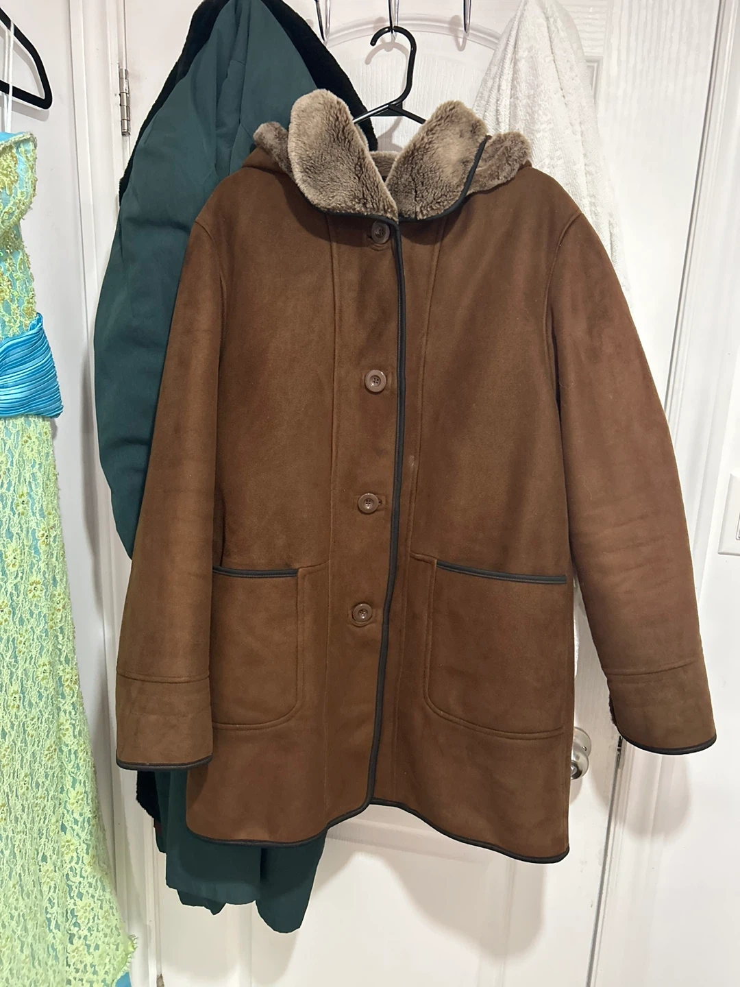 Warm brown jacket with a faux suede exterior and a cozy faux fur lining, complete with a hood. It's got button-up closure and handy pockets. Perfect for chilly days!
