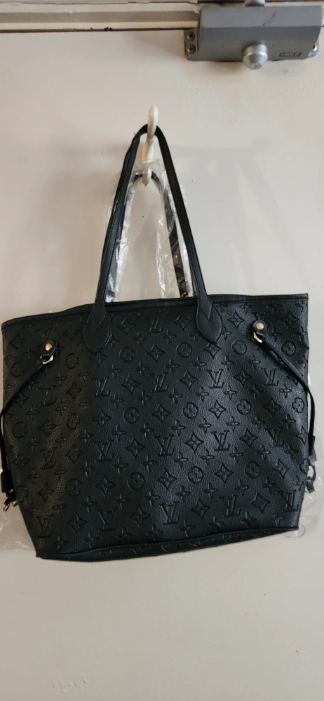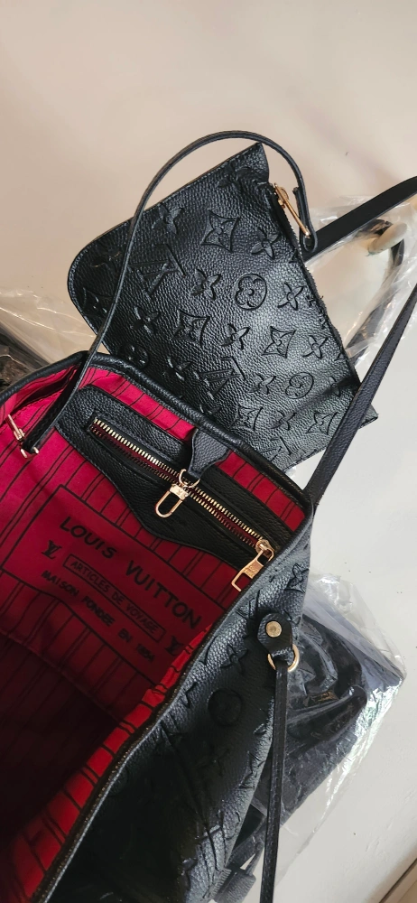 Black designer handbag with a gold-tone zipper. Has a red interior. Comes with a smaller matching handbag.