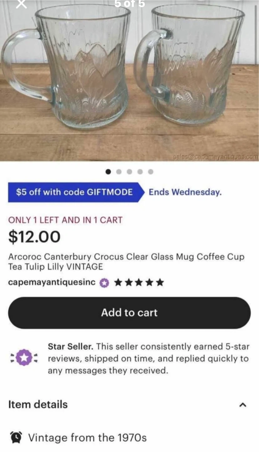 $15-3 Vintage Arcoroc Crocus clear glass coffee mugs.