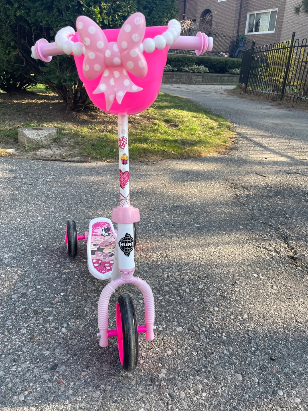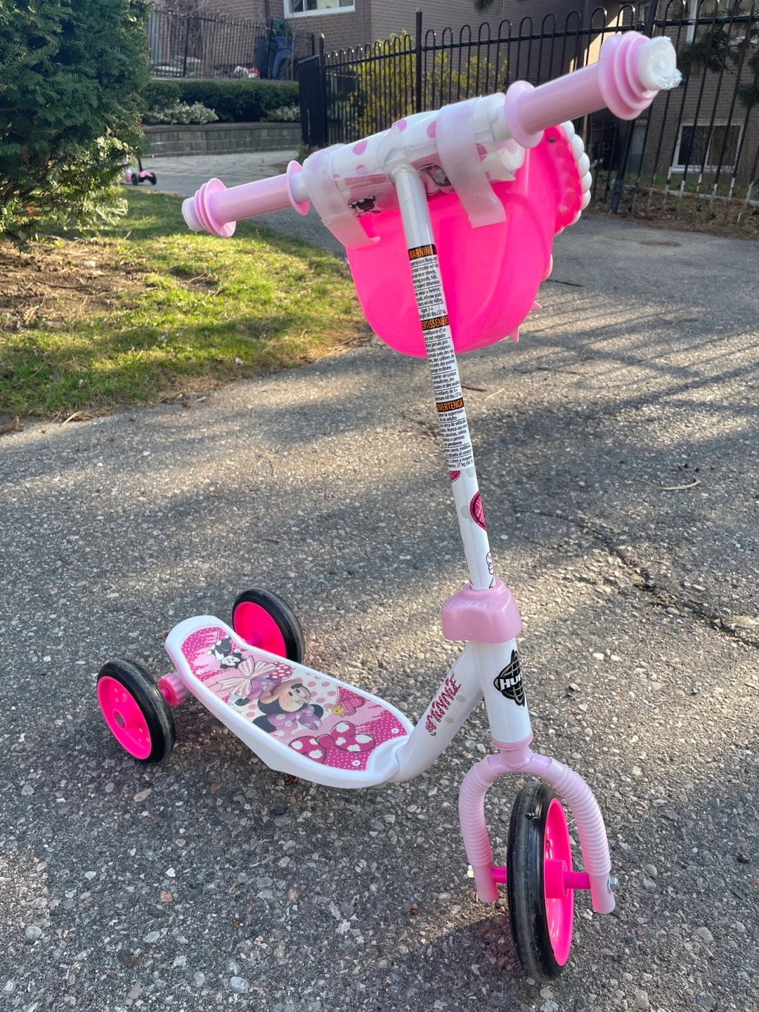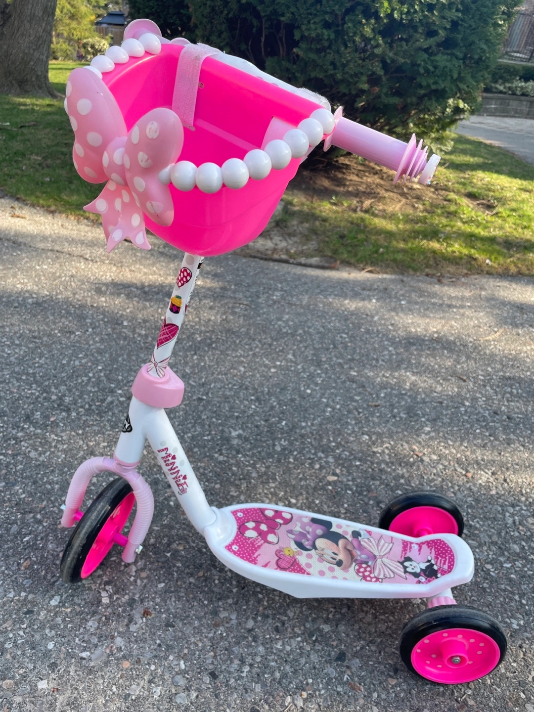 Pink and white toddler scooter. Features Minnie Mouse design. Includes a front basket. Three wheels for stability. Great for young children.