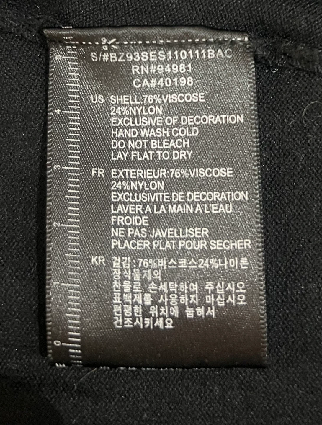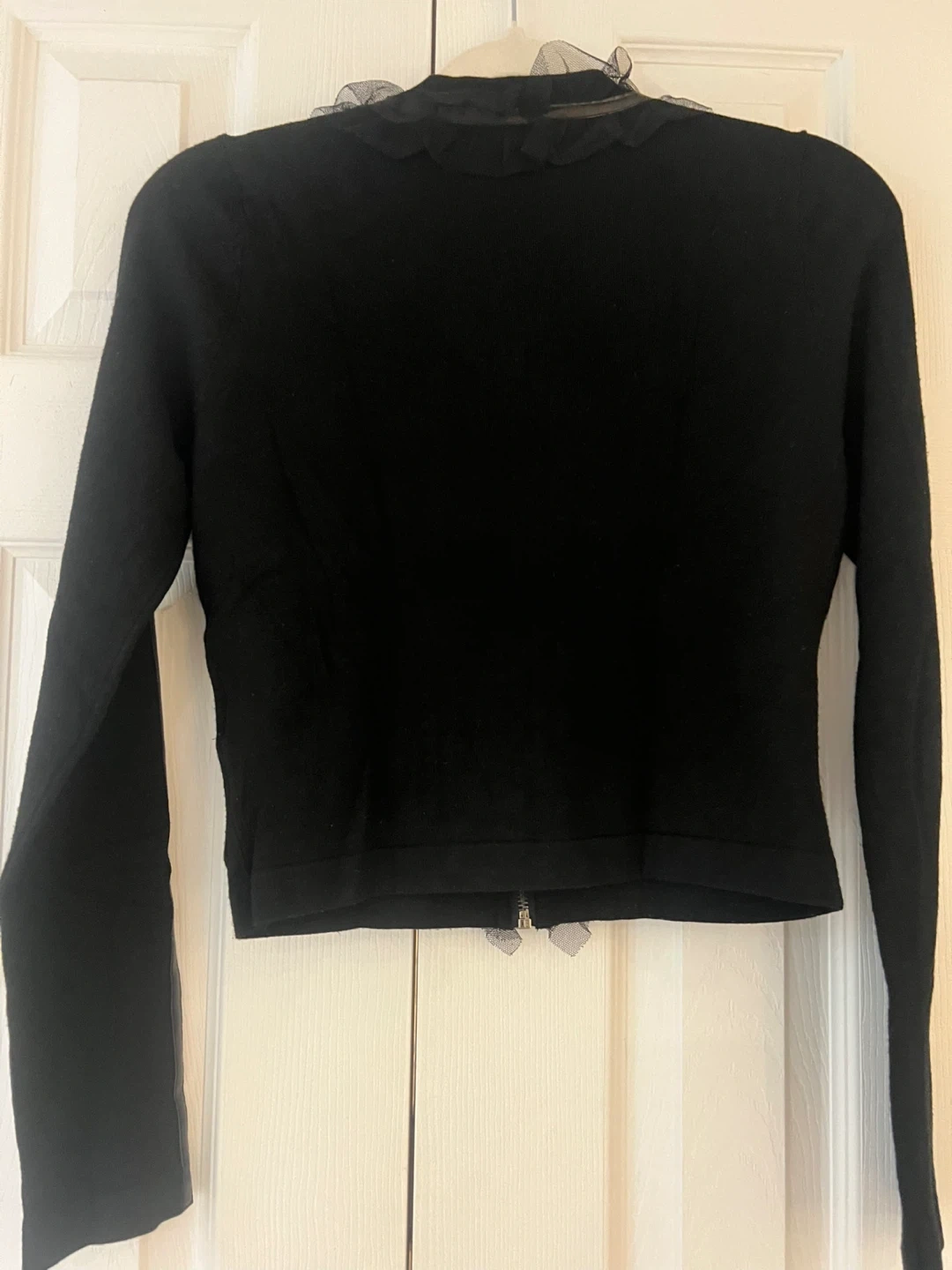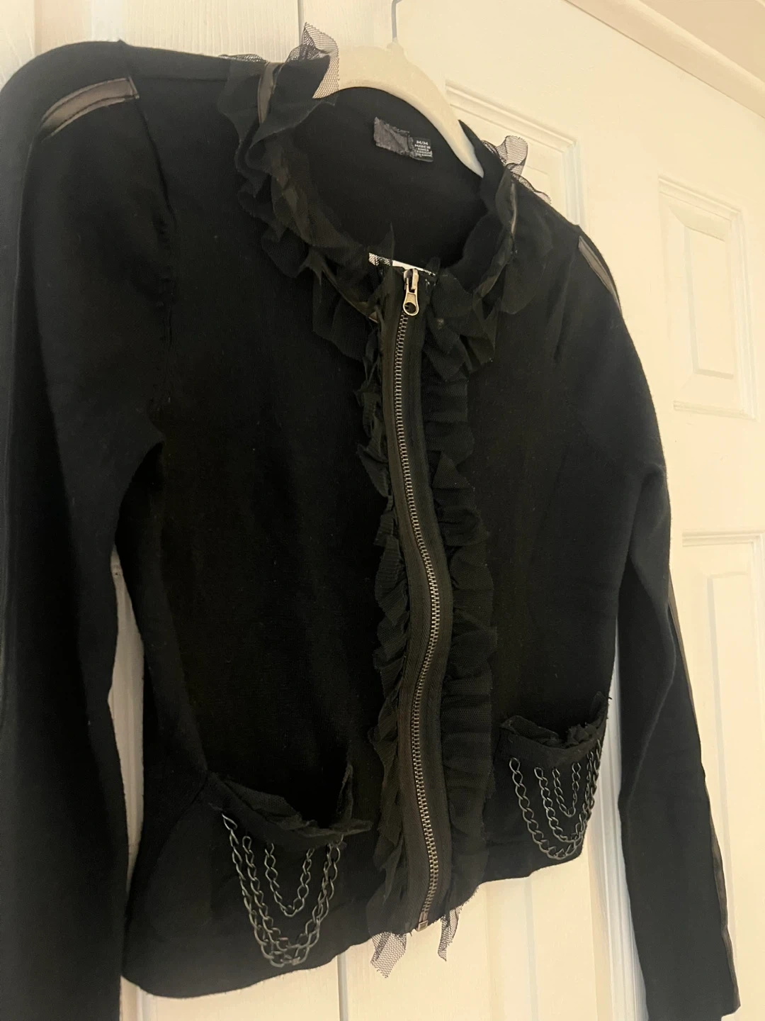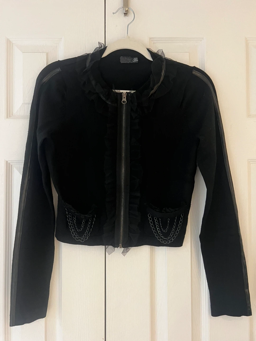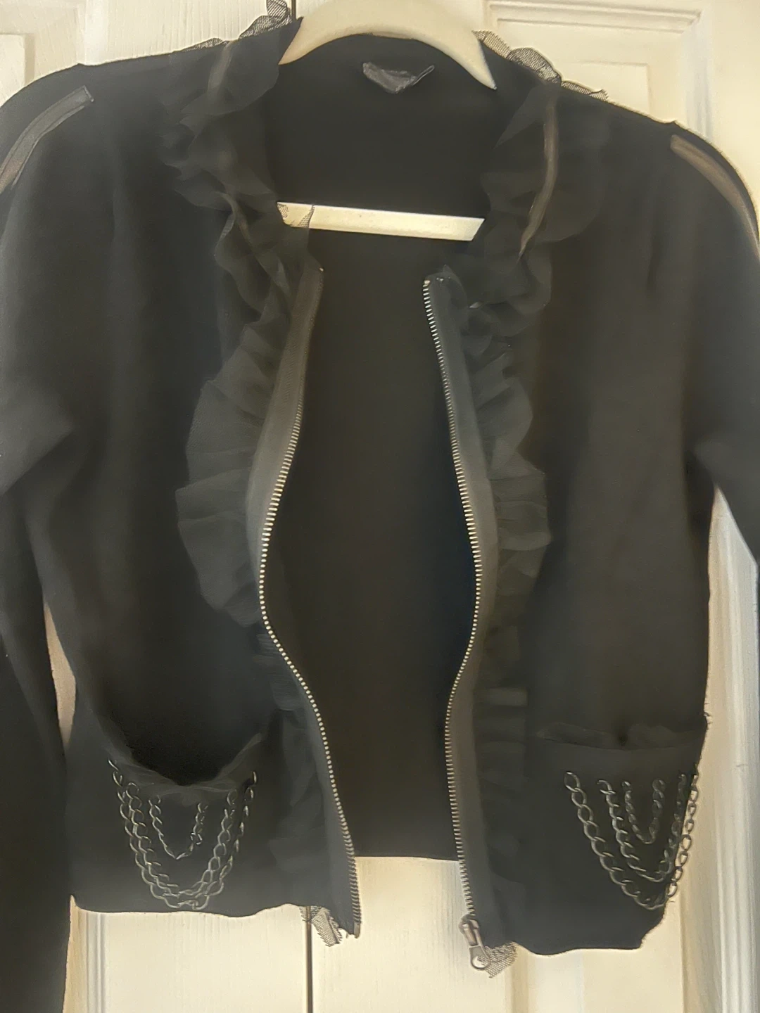 This black zipper jacket has unique ruffle and chain detailing in the pockets.