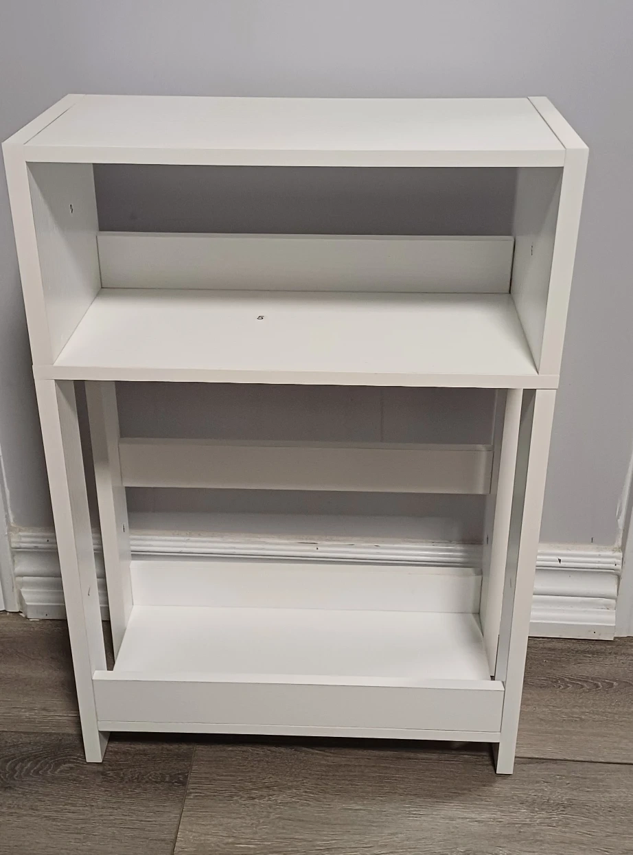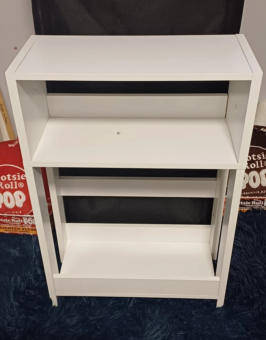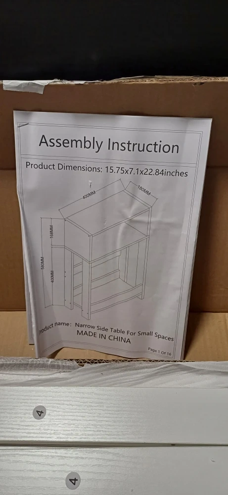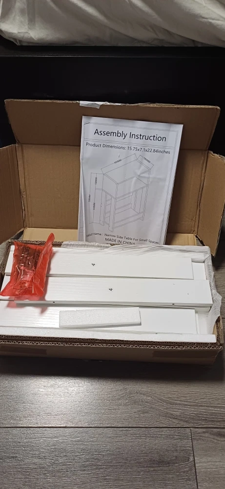 This narrow side table is perfect for small spaces! It's white and comes with assembly instructions. The product dimensions are 15.75 x 7.1 x 22.84 inches