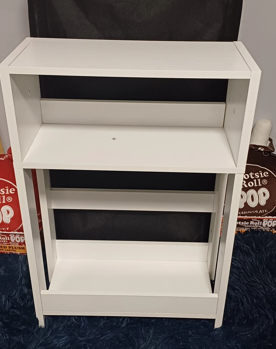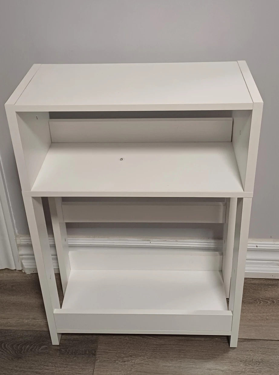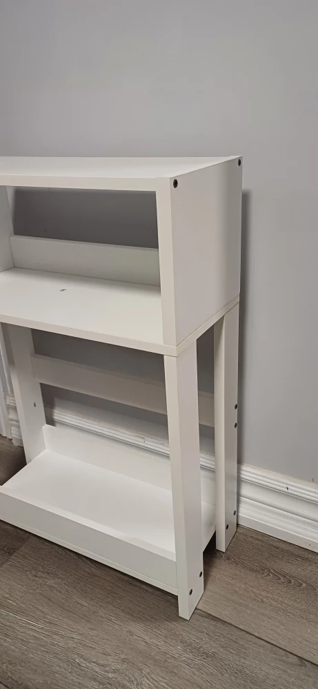 This narrow side table is perfect for small spaces! It's white and comes with assembly instructions. The product dimensions are 15.75 x 7.1 x 22.84 inches