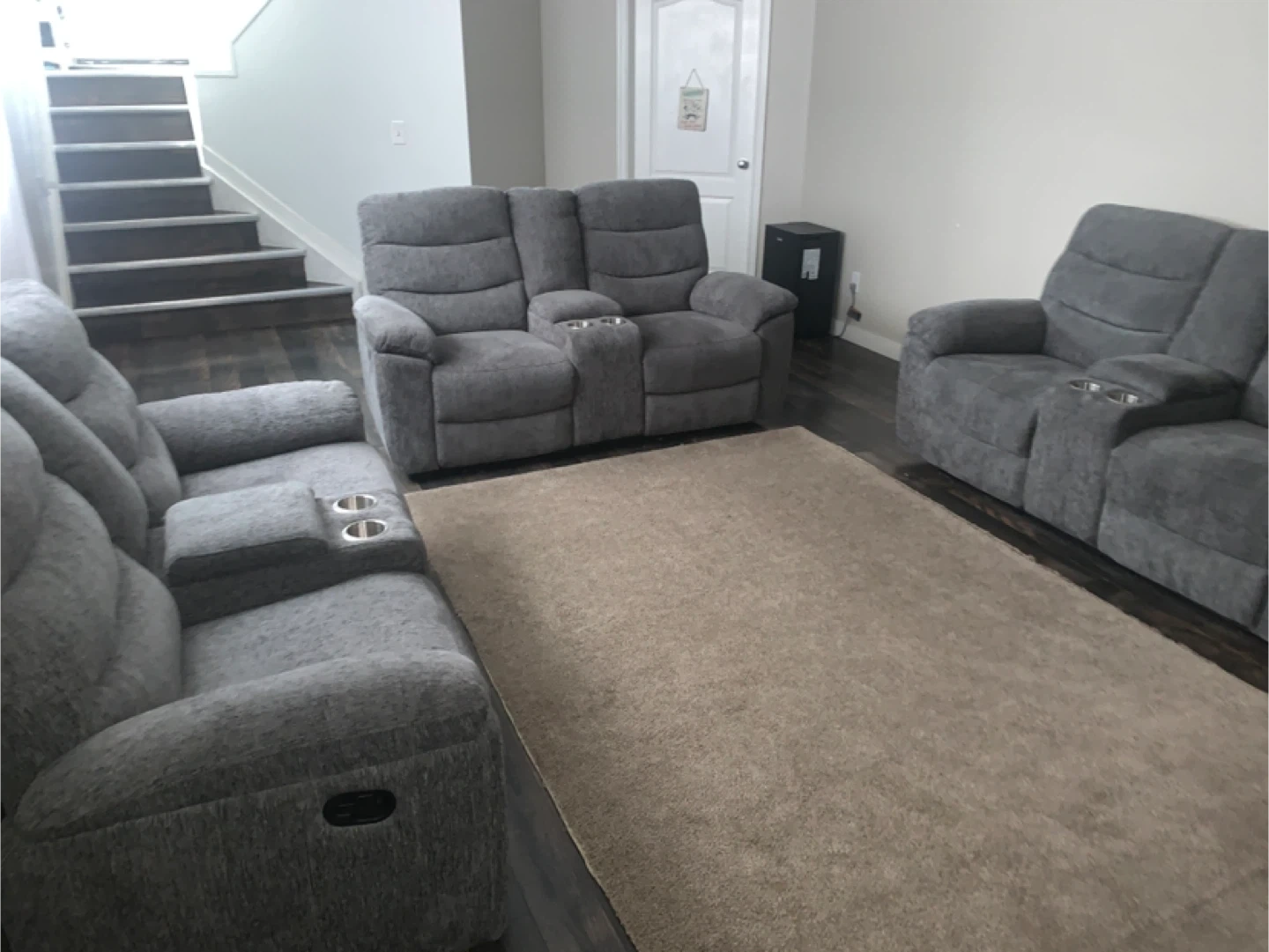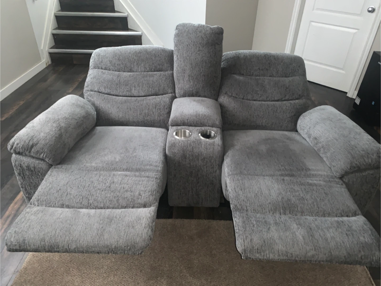 This grey recliner loveseat features two reclining seats with a centre console. It includes two built-in cup holders for convenience. The soft fabric makes it comfy for movie nights!