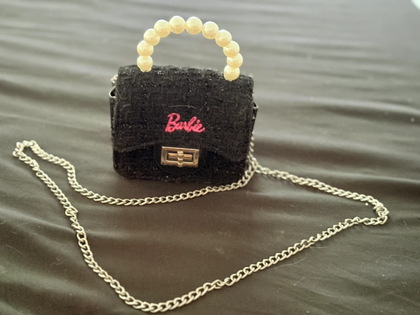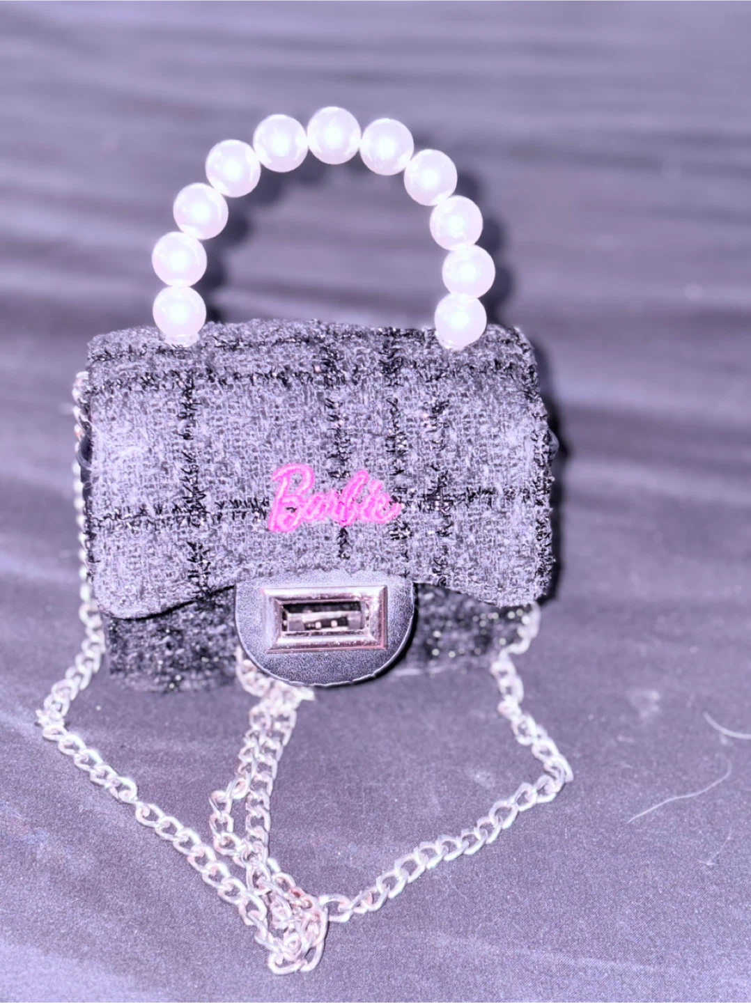 This is a cute black Barbie mini purse. It features a pearl bead handle and a silver chain strap. The purse has a small clasp closure for security.