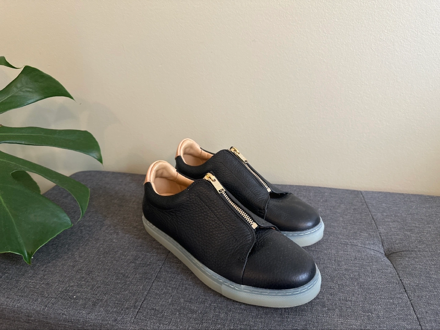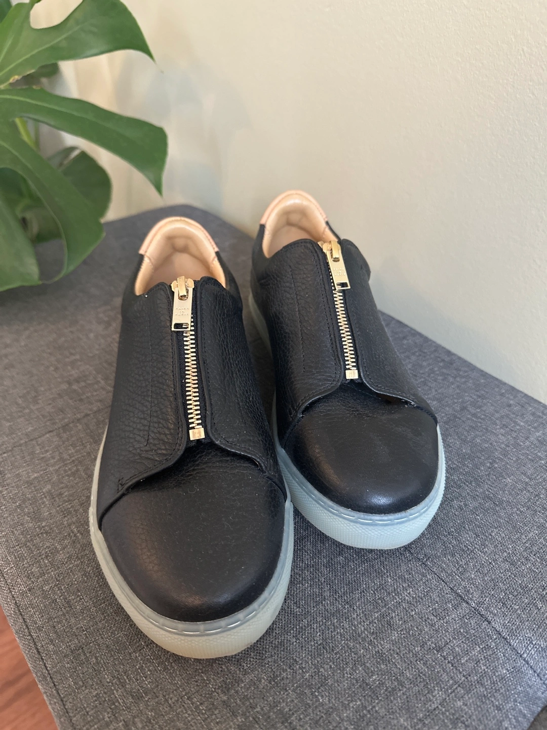 Made in Portugal Black leather sneakers with a gold zipper.