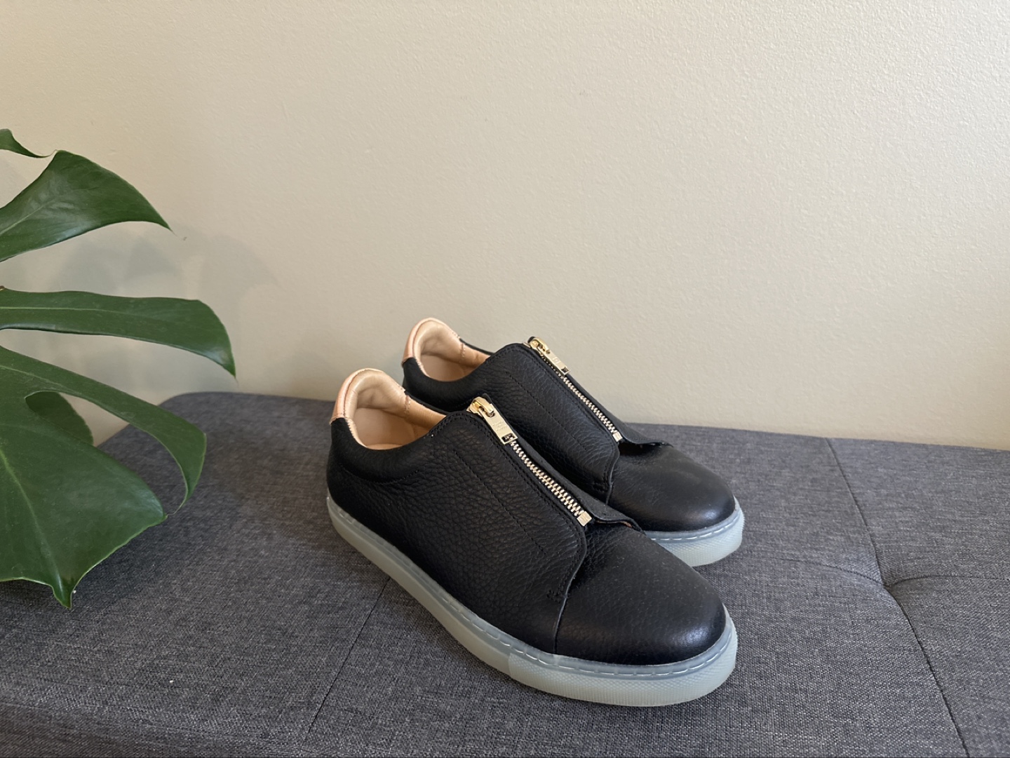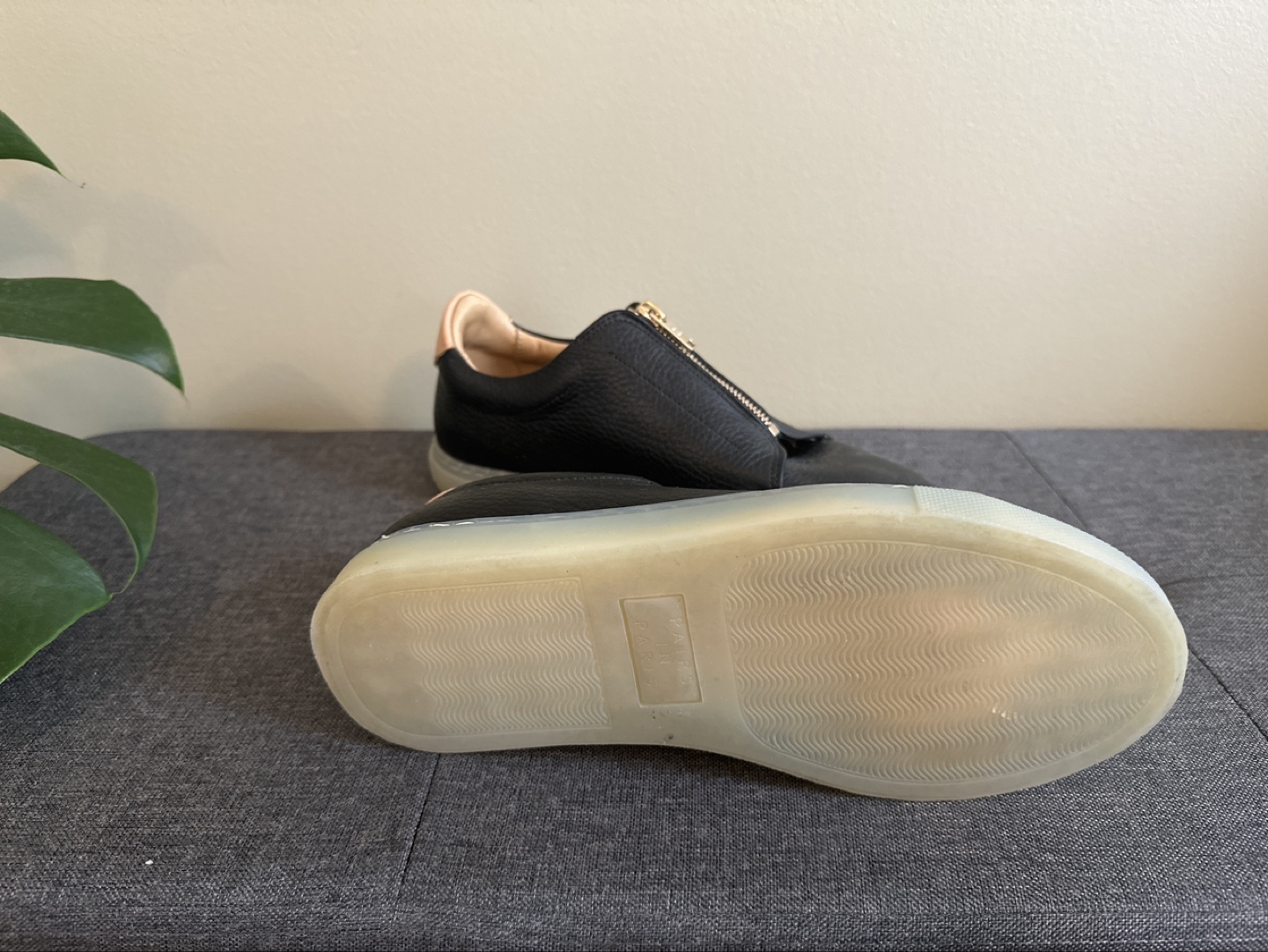 Made in Portugal Black leather sneakers with a gold zipper.