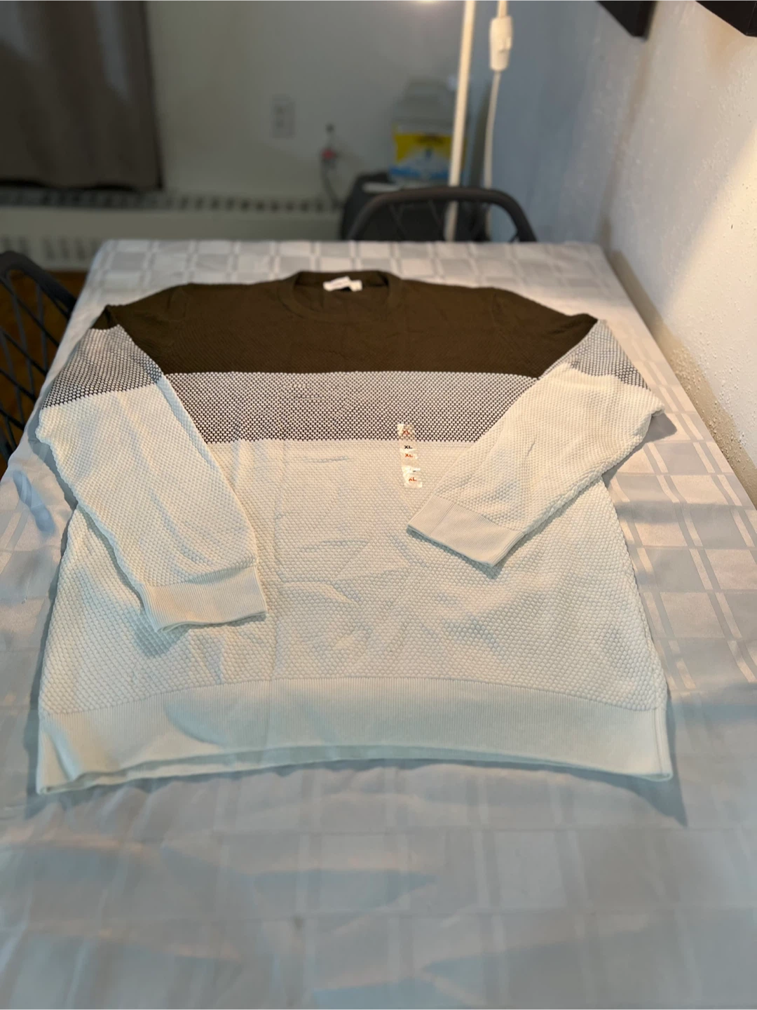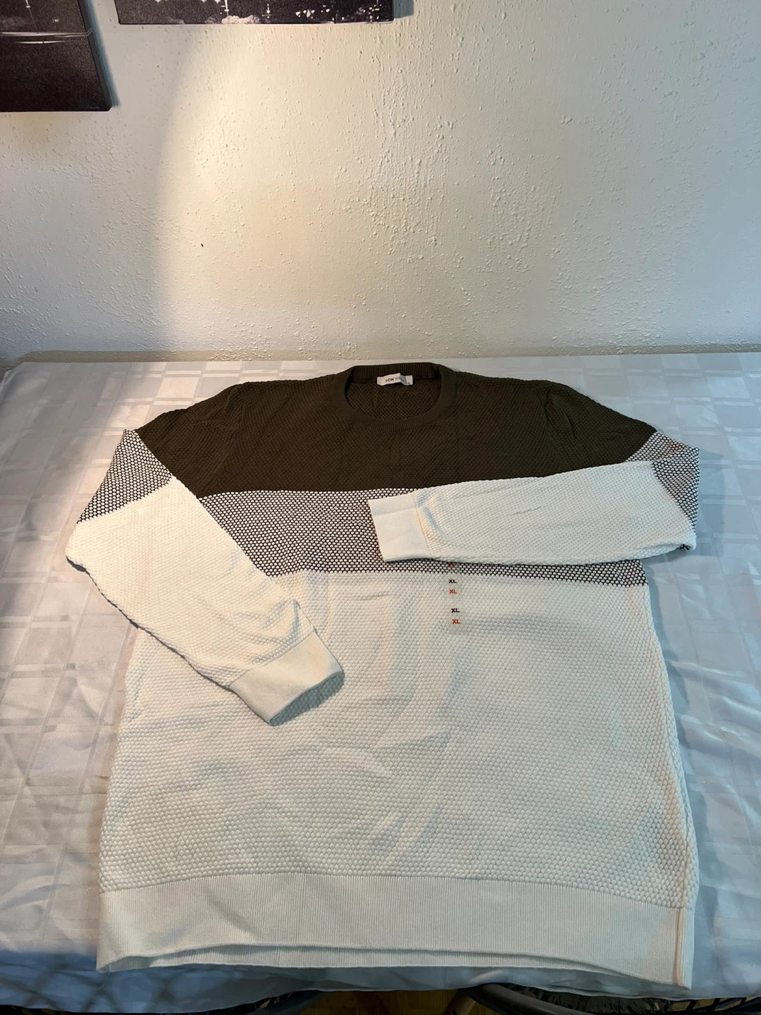 Selling a men's sweater from LC Waikiki in size XL. It features a unique colour block design with olive green, grey, and white. The material is a comfortable knit, perfect for layering!