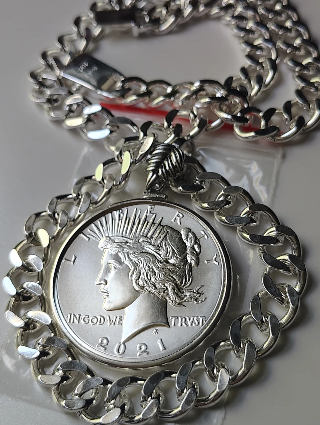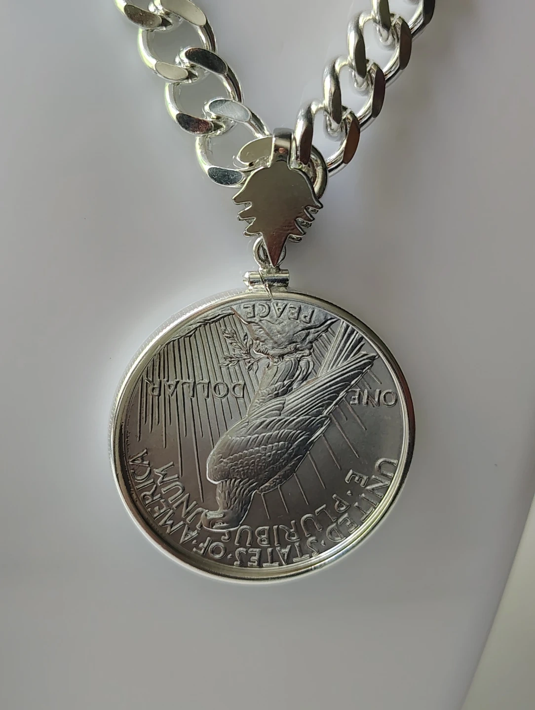 Hermoso collar chapado en plata con moneda de la paz certificada MS 69. 100th anniversary 1oz de plata pura, una verdadera joya numismatica.