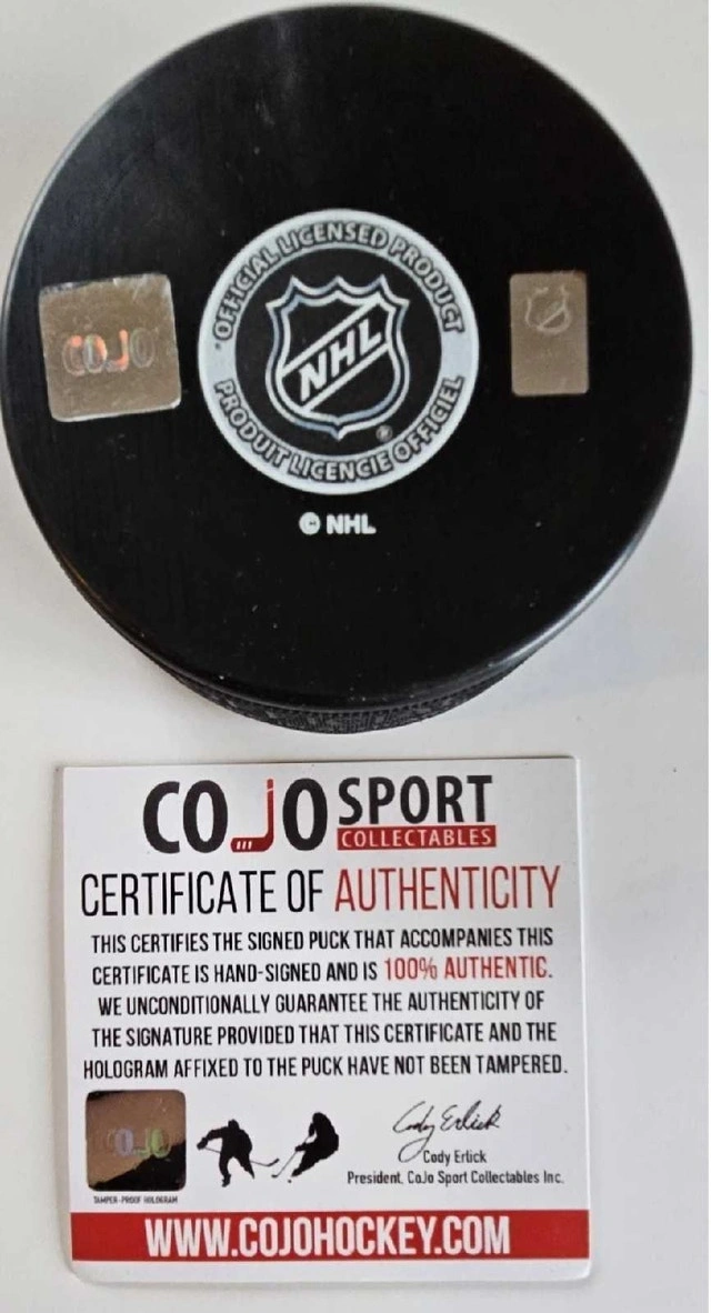 Experience a piece of hockey history with this Grant Fuhr Edmonton Oilers autographed puck. Celebrate the legacy of one of the most iconic goaltenders in NHL history with this original, signed collectible. Complete with a certificate of authenticity from COJO and COA, you can be assured of its validity and quality. Perfect for any die-hard hockey enthusiast or collector of sports memorabilia, this puck is a must-have. It represents not only a piece of sports greatness but also a tangible connection to the Edmonton Oilers' storied past. Display it proudly or add it to your collection of hockey treasures.