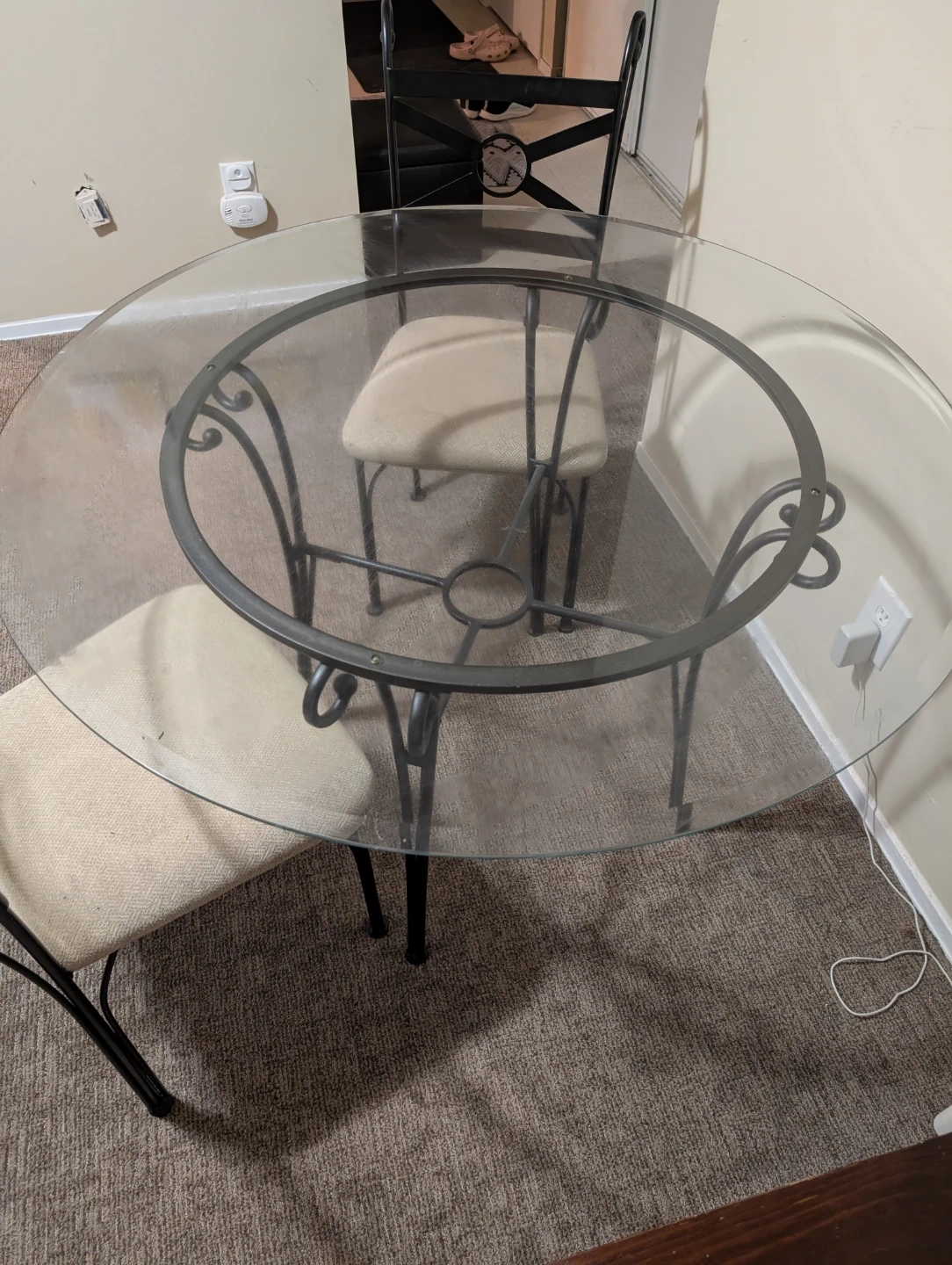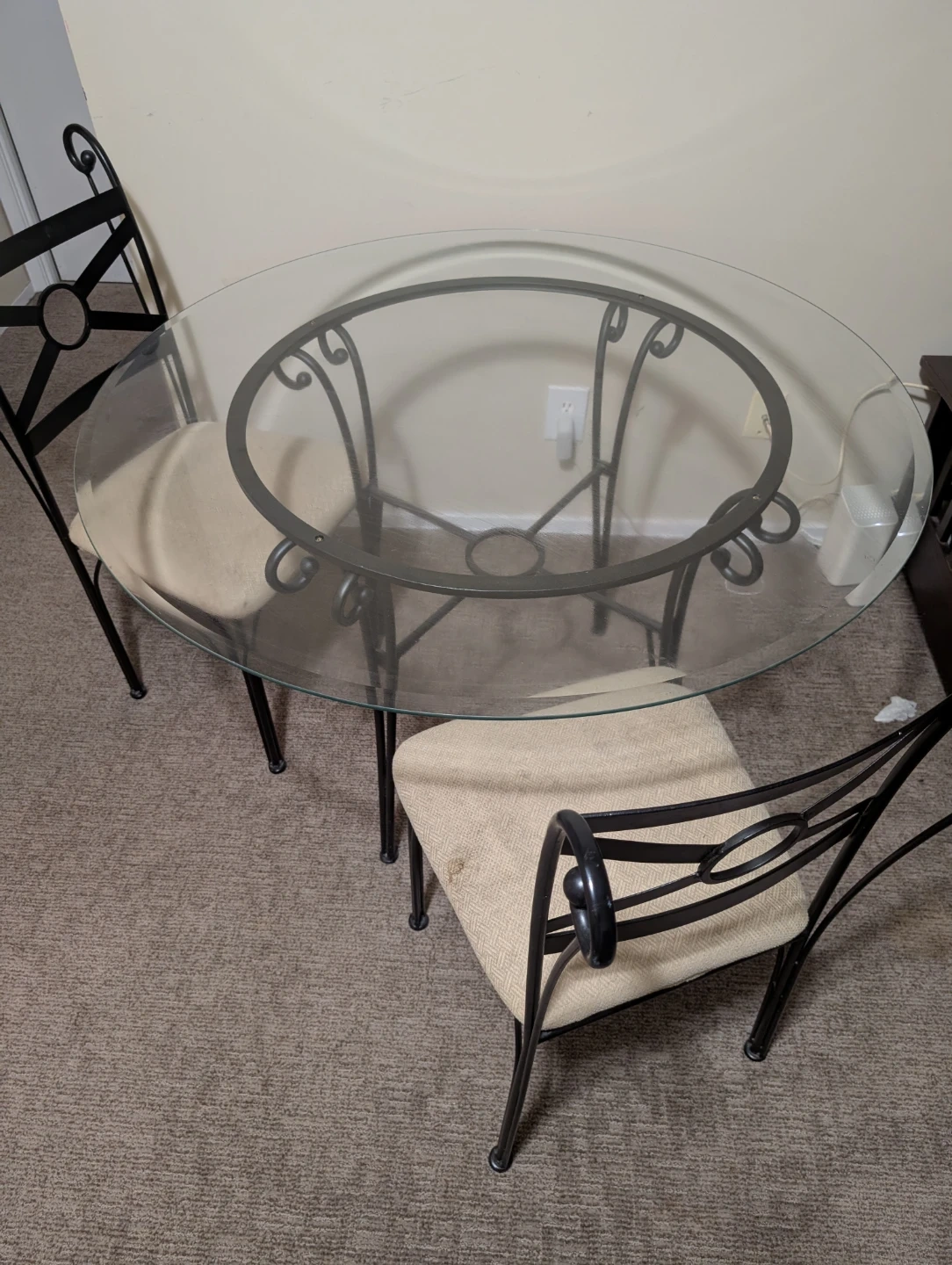 This bistro set includes a round glass-top table with a metal base and two metal-framed chairs with fabric seats. It's a great option for a small dining area or breakfast nook. Actually has 4 chairs.