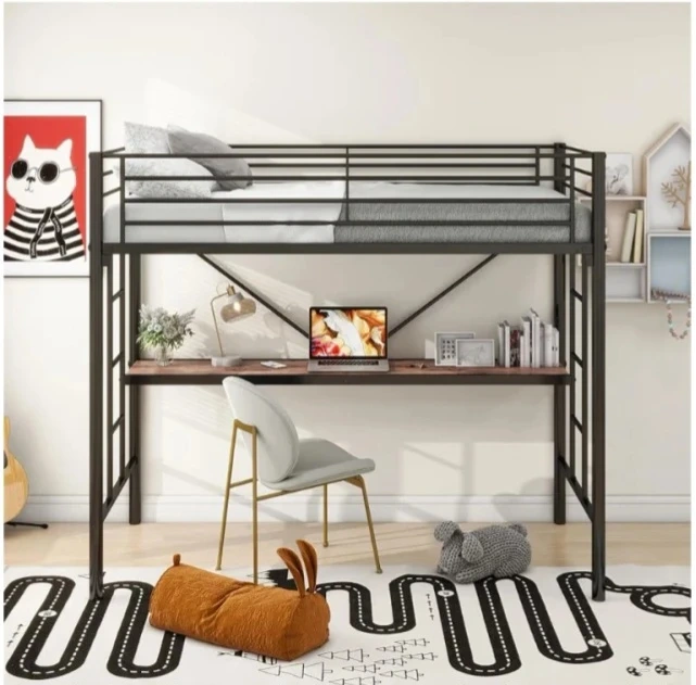This black metal loft bed features a built-in desk underneath the sleeping area. It's constructed with a sturdy metal frame and includes a wood-tone desk surface. Assembly required.