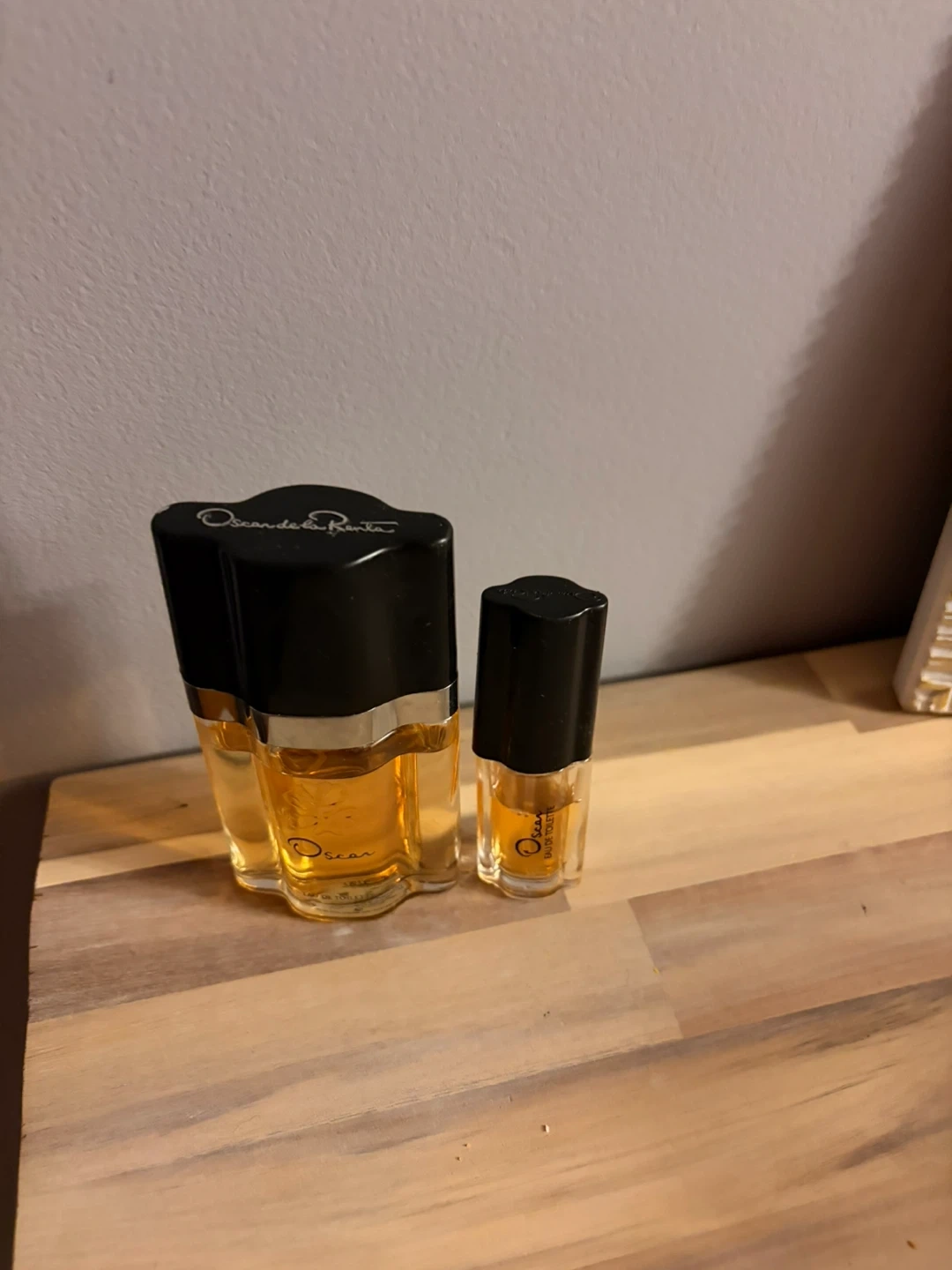 Two bottles of Oscar de la Renta Oscar Eau de Toilette. Includes a larger bottle and a travel-sized one. A classic scent for women.