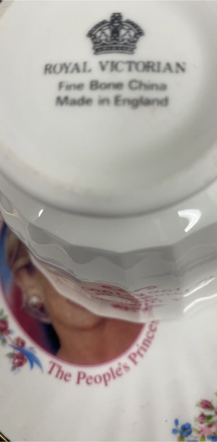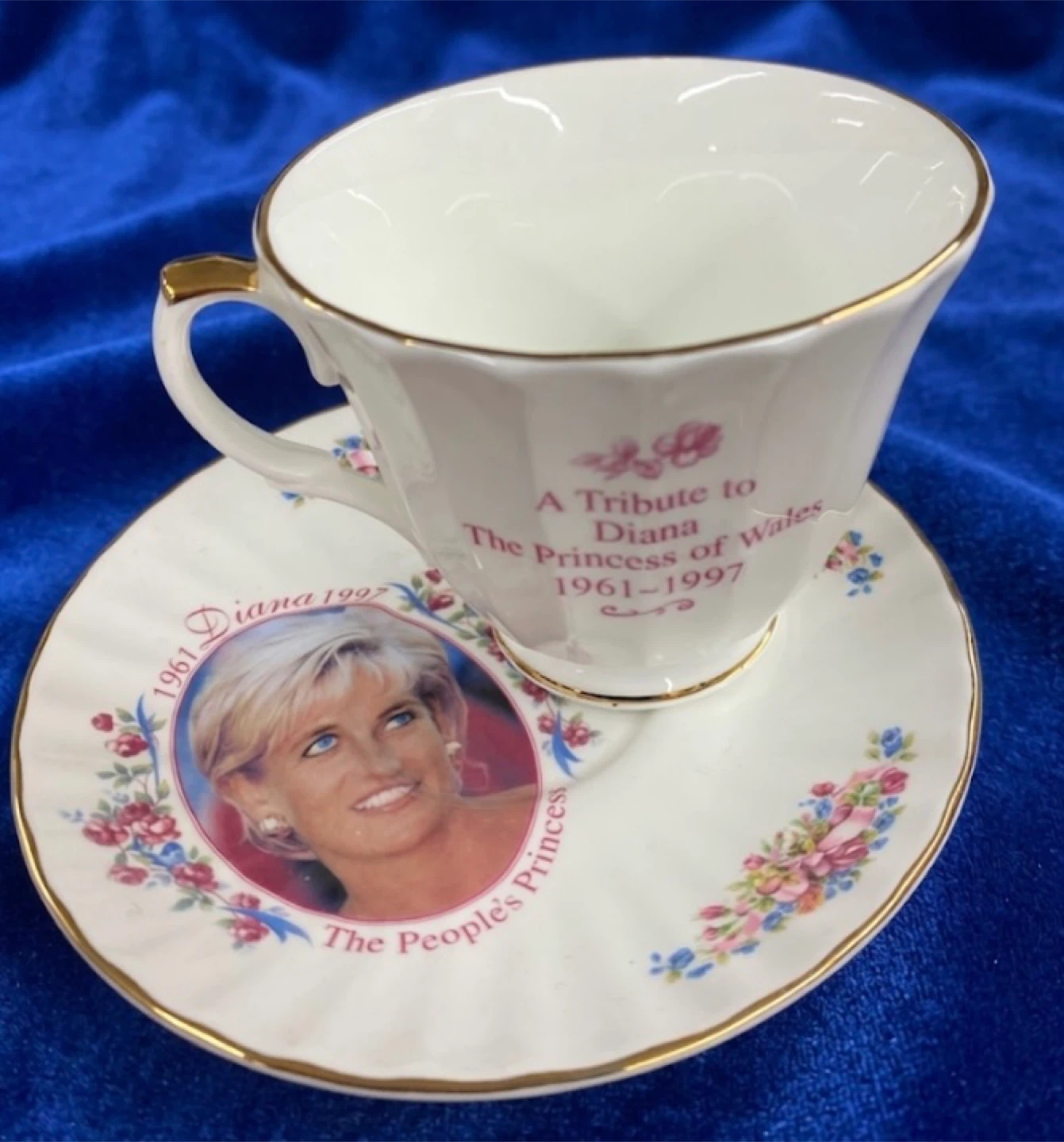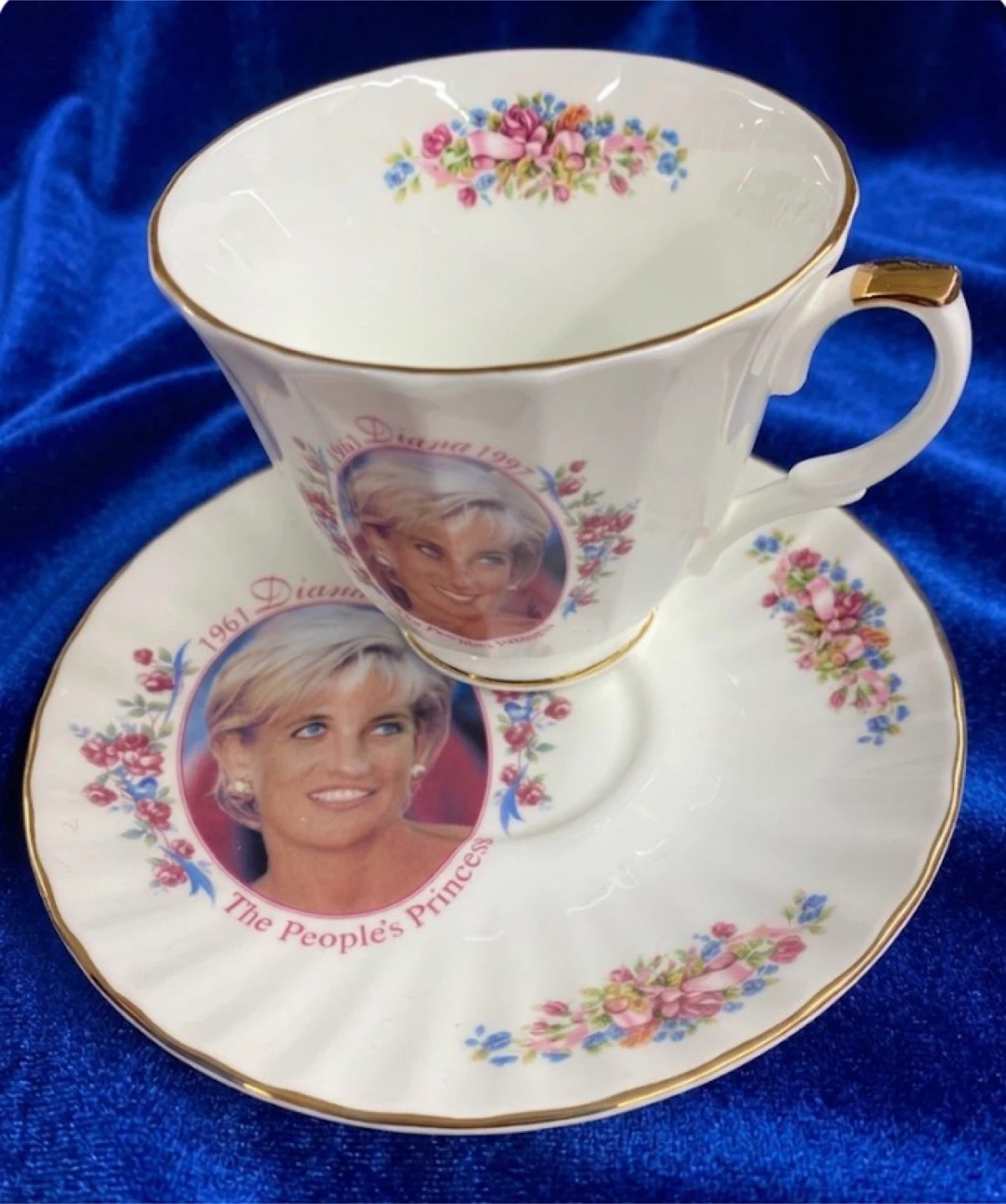 A Royal Victorian fine bone china teacup and saucer. It's a tribute to Diana, the Princess of Wales, featuring her image and dates 1961-1997. Made in England.