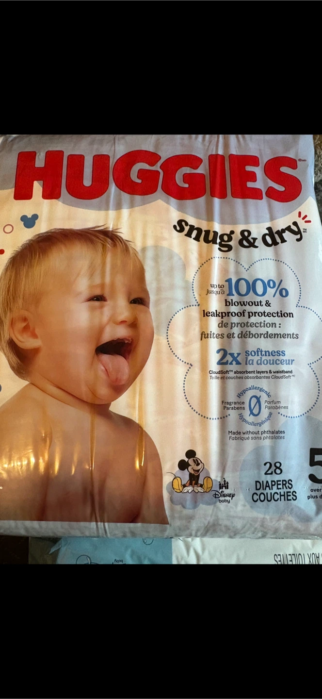 Selling a pack of Huggies Snug & Dry diapers! This pack has 28 diapers. They offer up to 100% blowout and leakproof protection, and are made with CloudSoft absorbent layers for extra softness. They're also hypoallergenic and made without phthalates.
