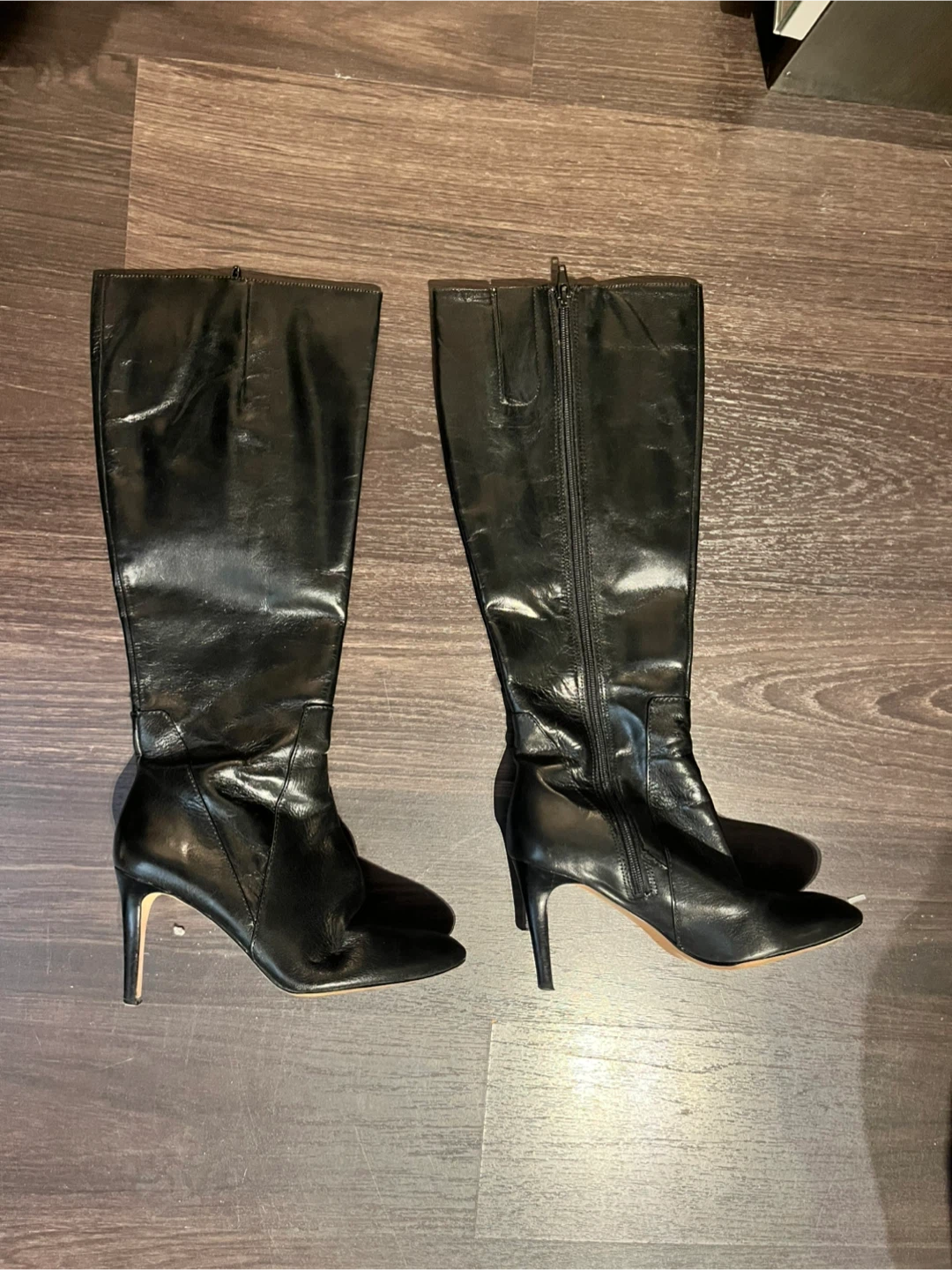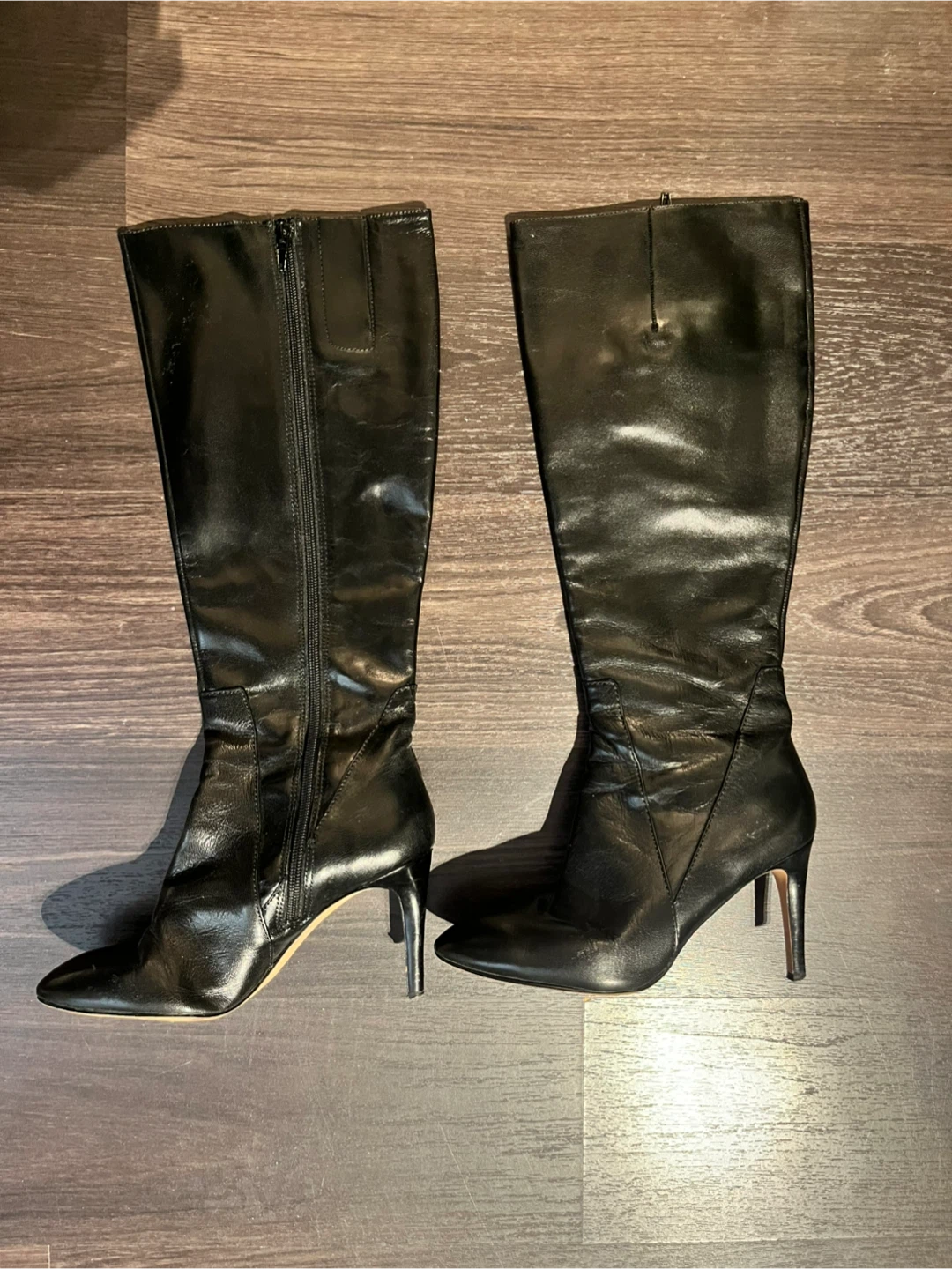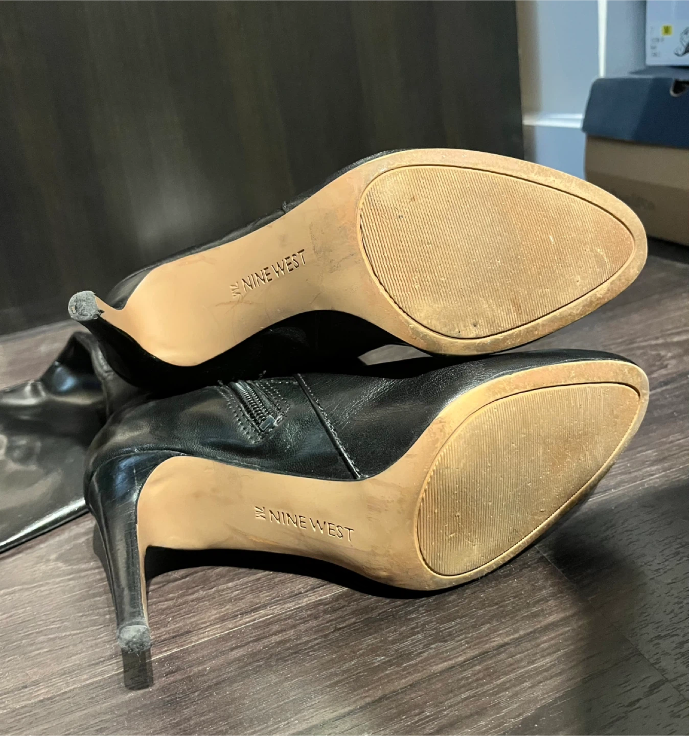 Classic black knee-high boots from Nine West. Leather upper with a synthetic lining and sole. These boots feature a side zipper for easy wear.