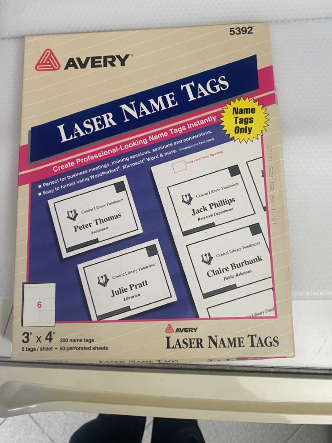 Create professional-looking name tags instantly for business meetings, training sessions, seminars and conventions. These tags are perfect for events and easy to format using WordPerferct and Microsoft Word. Each package includes 300 name tags, with 6 tags per sheet on 50 perforated sheets.
