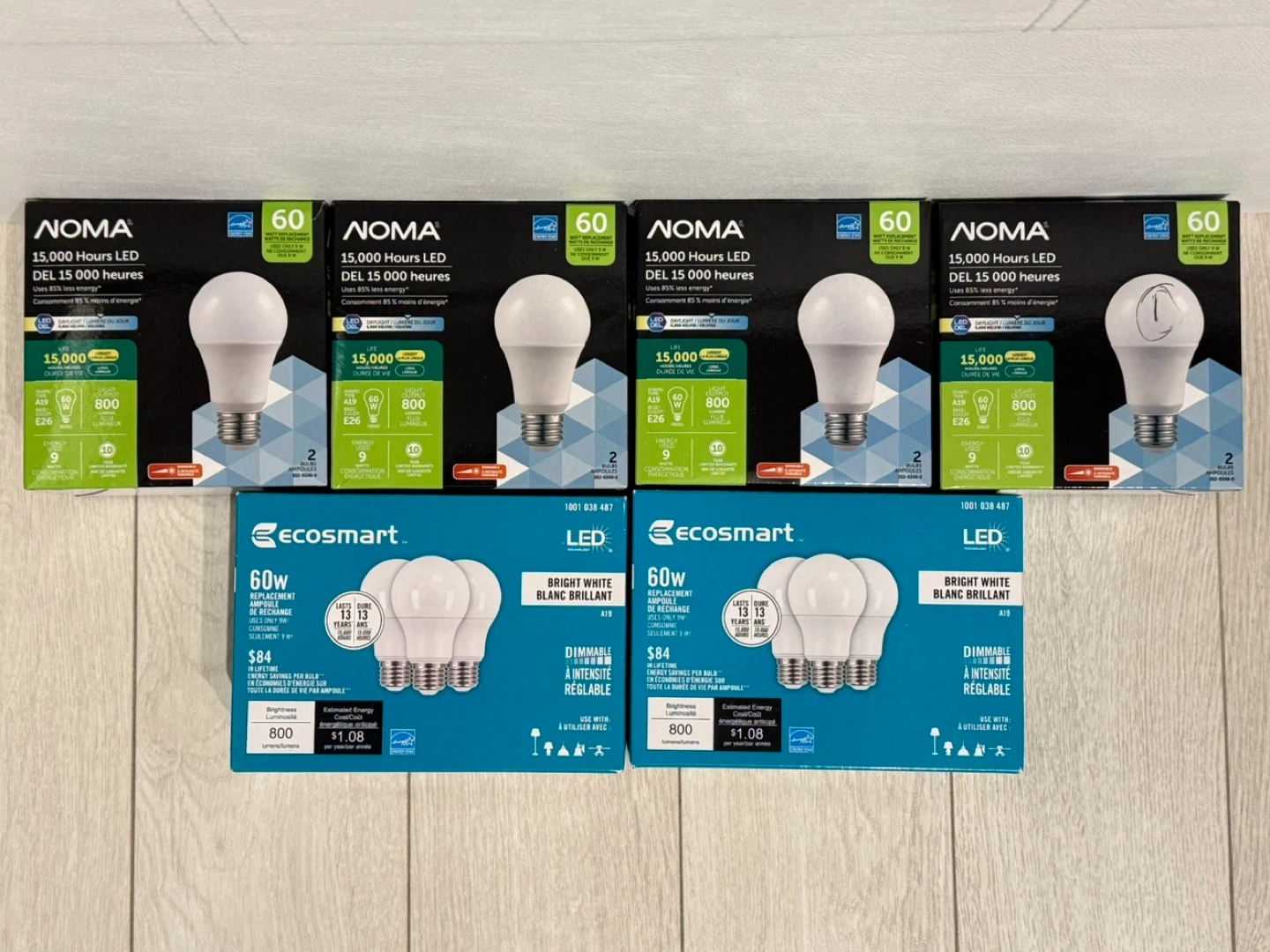 These are NOMA 15,000 Hour LED bulbs. Also included are Ecosmart 60W Bright White LED bulbs. The NOMA bulbs are 9W and 800 lumens. The Ecosmart bulbs are dimmable and A19 type.
