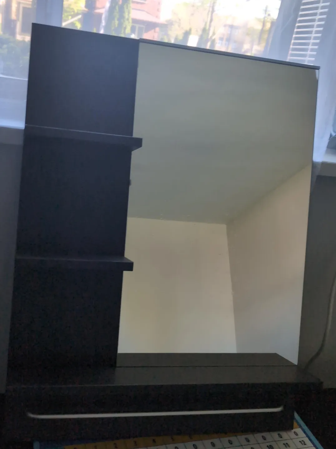 hanging vanity mirror. Features a large mirror and three shelves for storage. Dark brown finish.