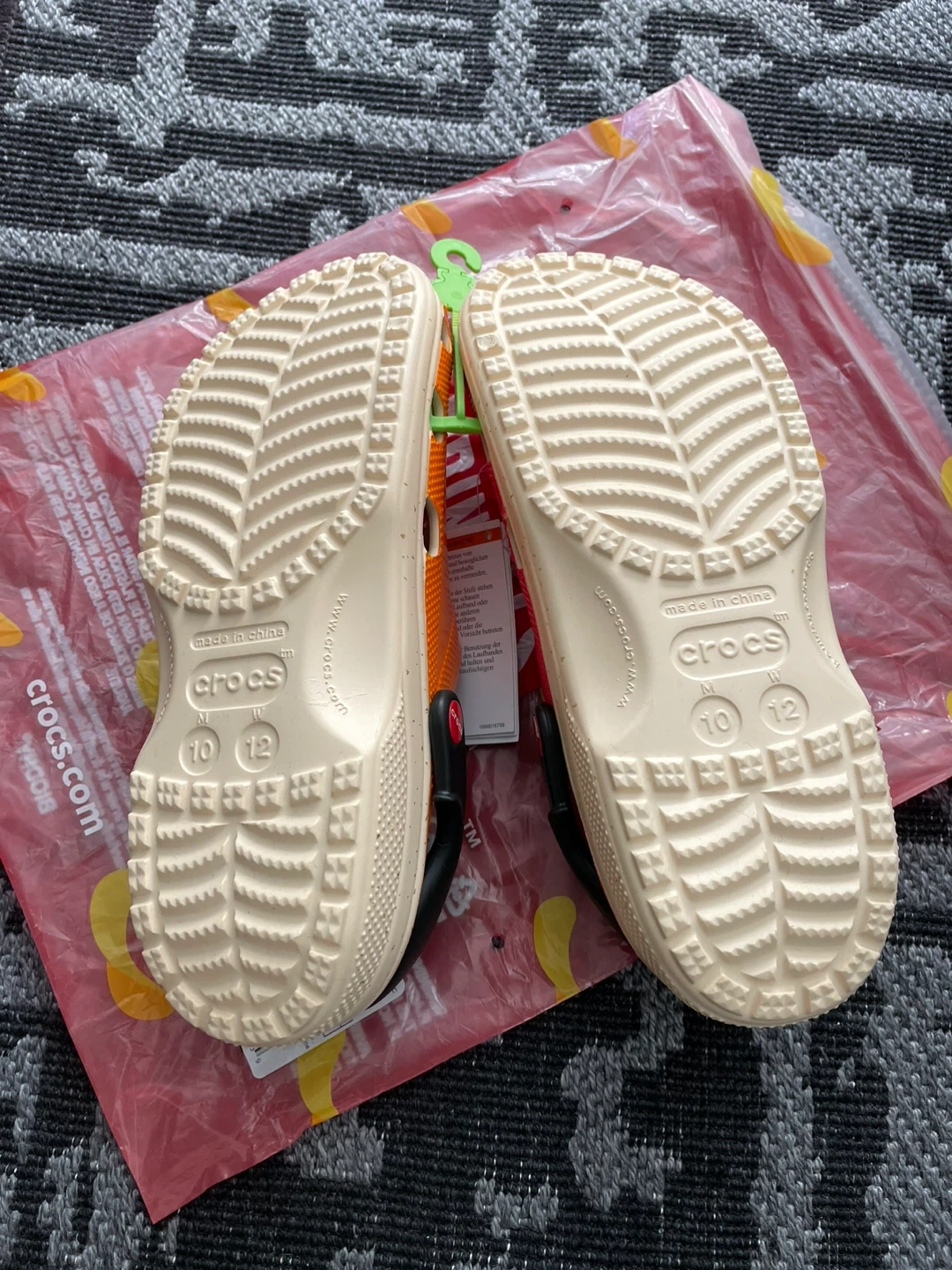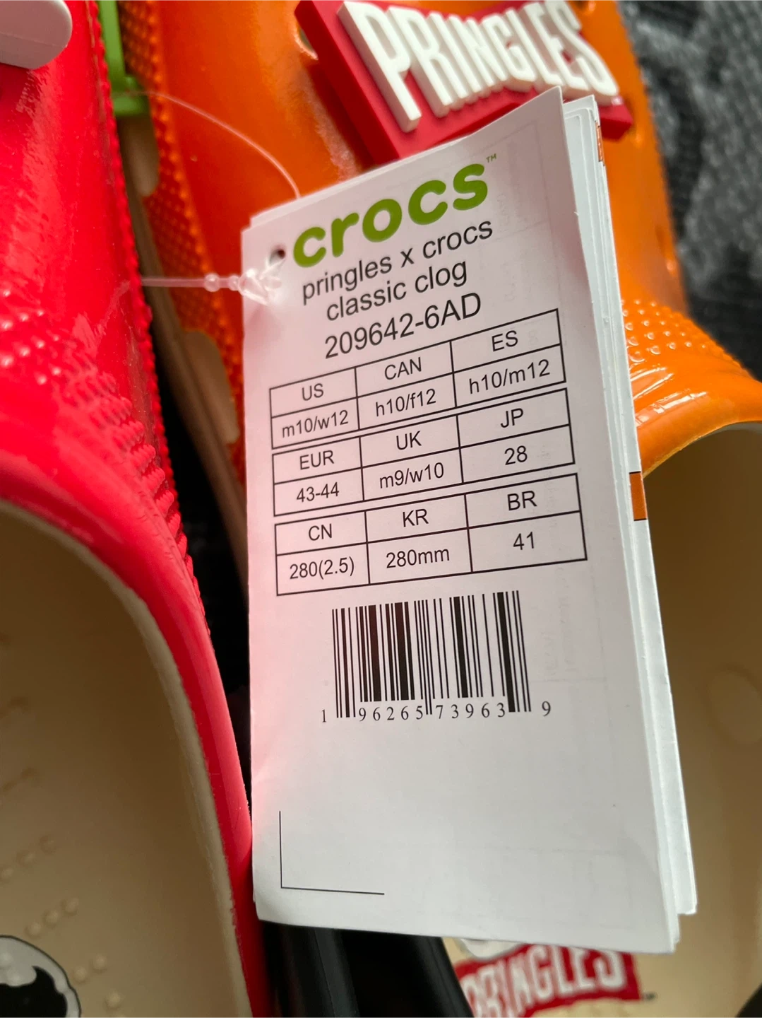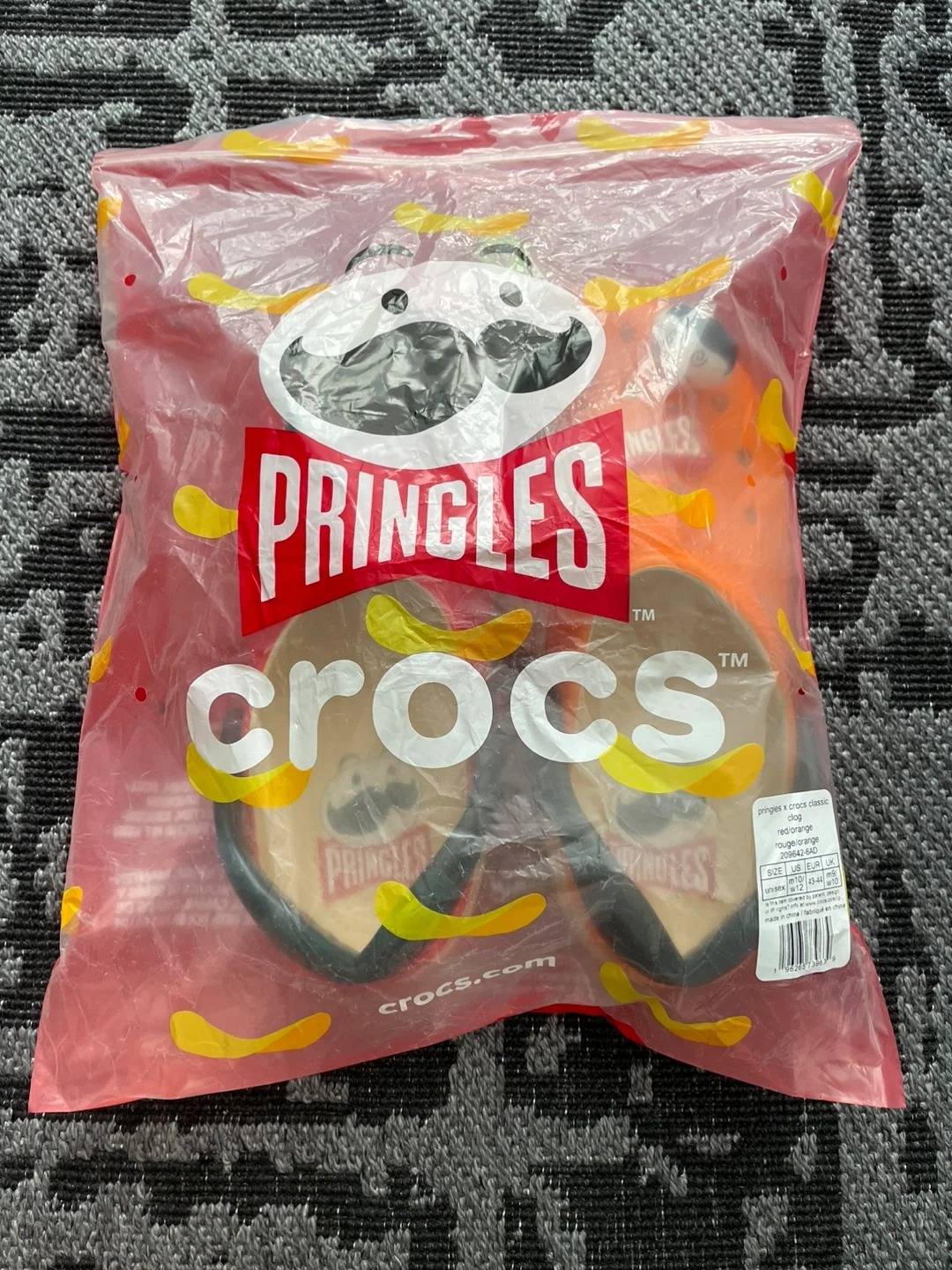 Brand new Crocs classic clogs, a fun limited collaboration with Pringles. These clogs come in a vibrant red and orange. Includes Pringles-themed Jibbitz.