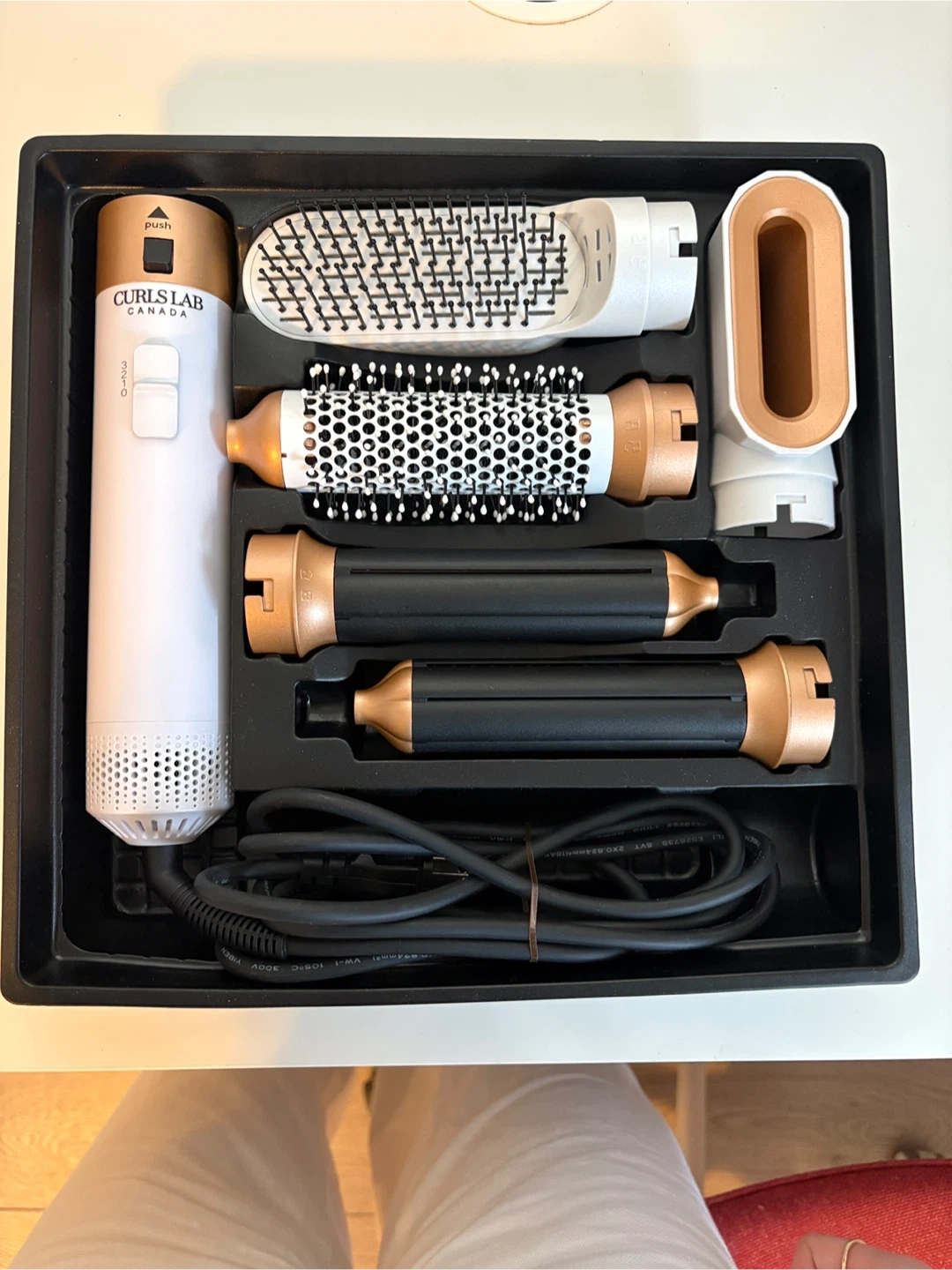 This set includes a Curls Lab Canada hair styler with multiple attachments. It has a main unit and several interchangeable brush heads and a concentrator nozzle. All components fit neatly into the included black tray.