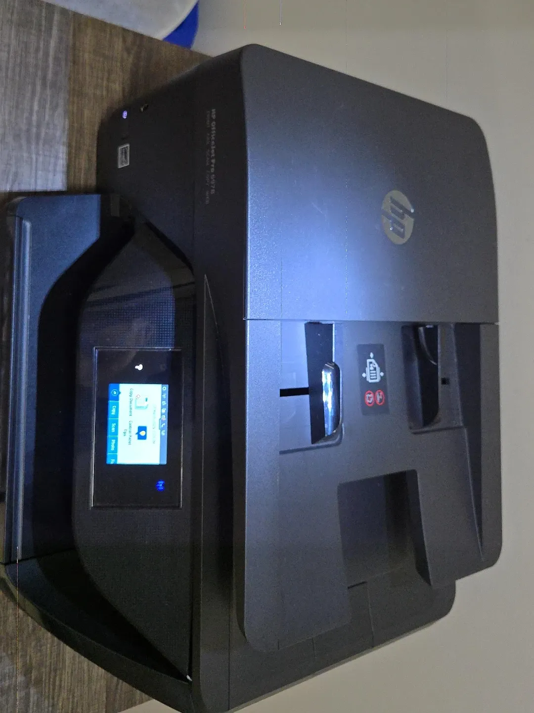 This is an HP OfficeJet Pro 9078 all-in-one printer. It's a black inkjet printer with a touchscreen display. It supports print, copy, scan, and fax functions.