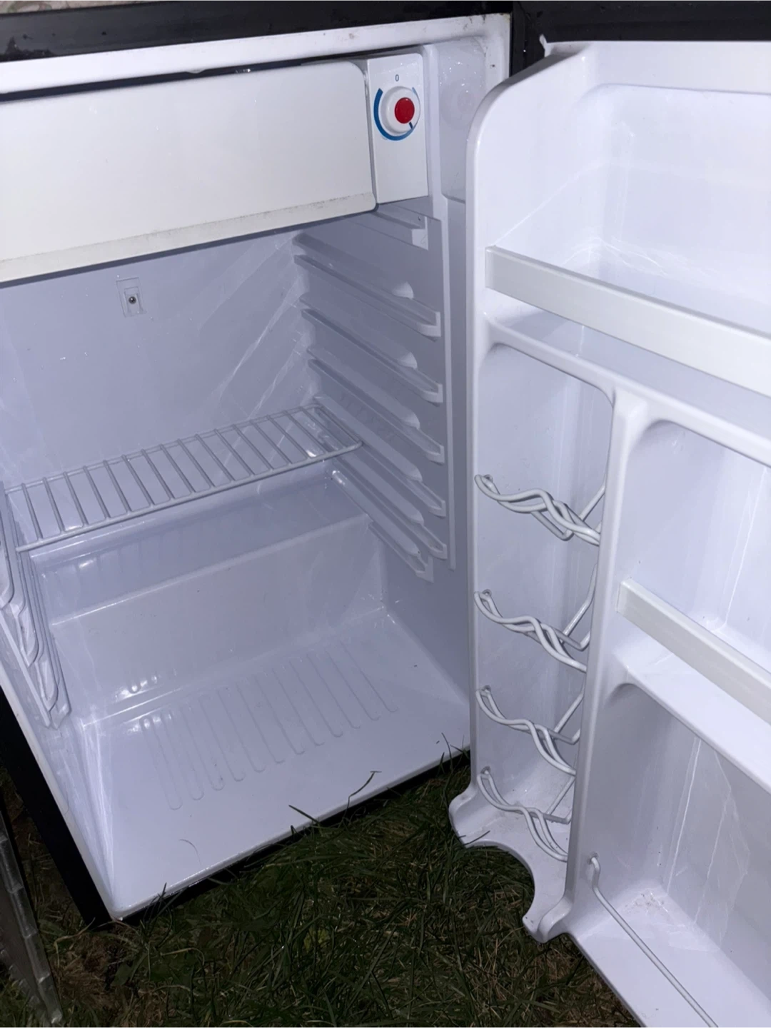 Selling a black Danby Premiere mini fridge. It's in great shape and perfect for a dorm room, office, or small space. It has a compact design with interior shelving for organization. Used for a drink fridge but am now sober so wish to have it gone. Stored outside for 1 week but has been cleaned. Photo is with the shelves removed but still comes with. Has a small freezer