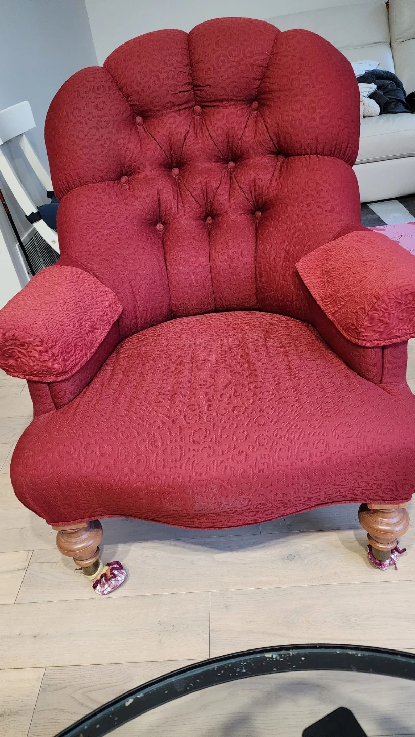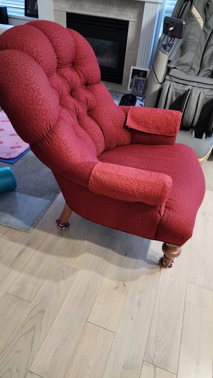 A deep red accent chair with button tufting and patterned fabric. It has carved wooden legs and padded armrests. This chair would be a great addition to a living room or den.