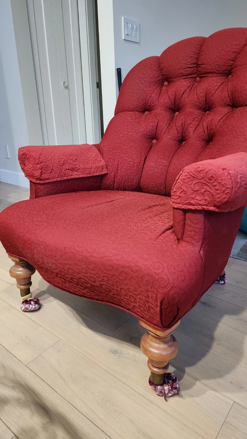 A deep red accent chair with button tufting and patterned fabric. It has carved wooden legs and padded armrests. This chair would be a great addition to a living room or den.
