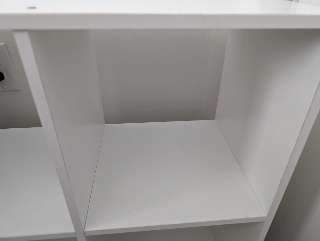 IKEA White bookcase, 6 square sections, each section is 28.5cm. Moving abroad so I need to sell it! Minor marks, but it would be easy to paint! Pick up only - from Condo near Fairview Mall. (does not include the gray boxes)