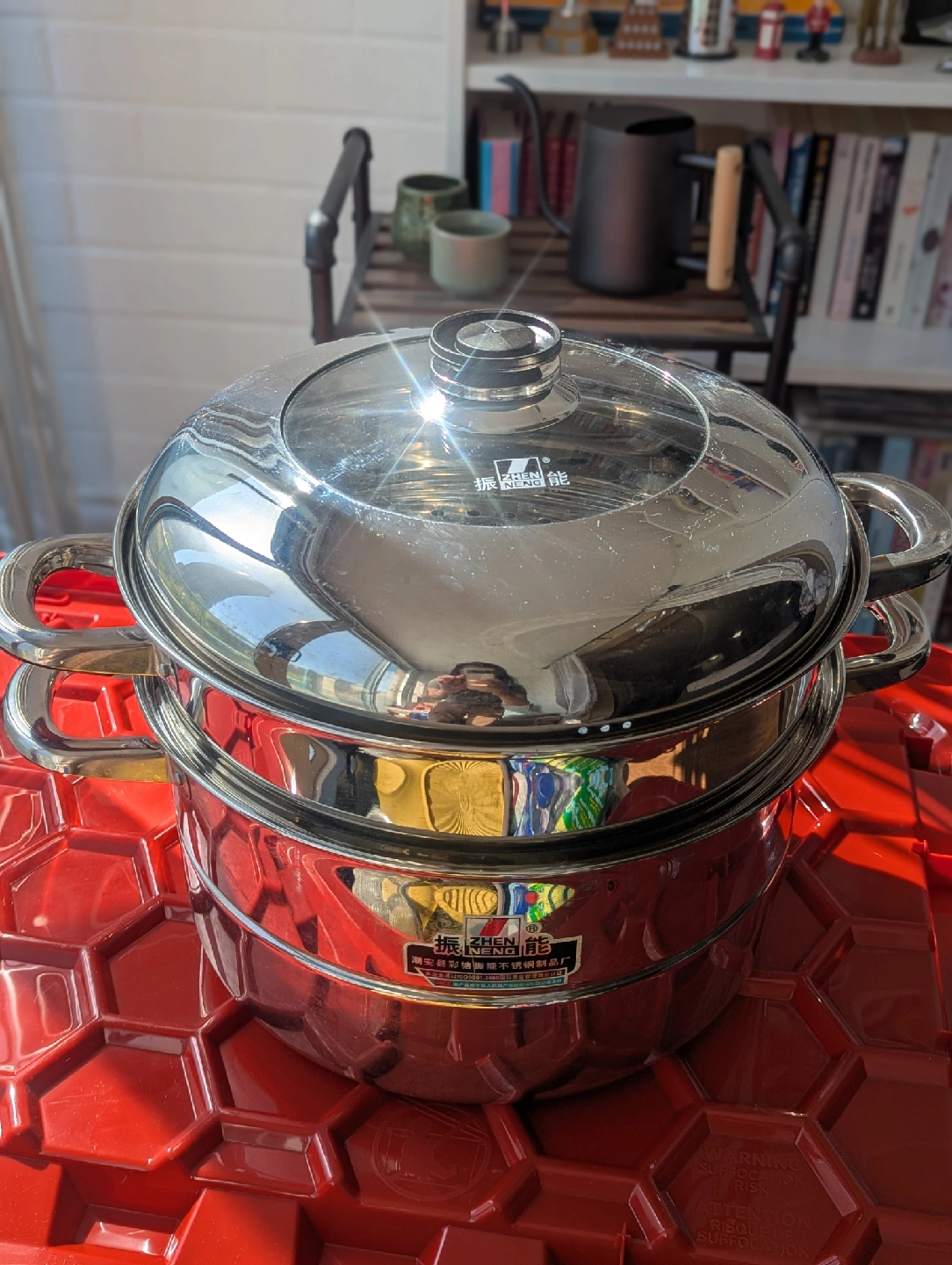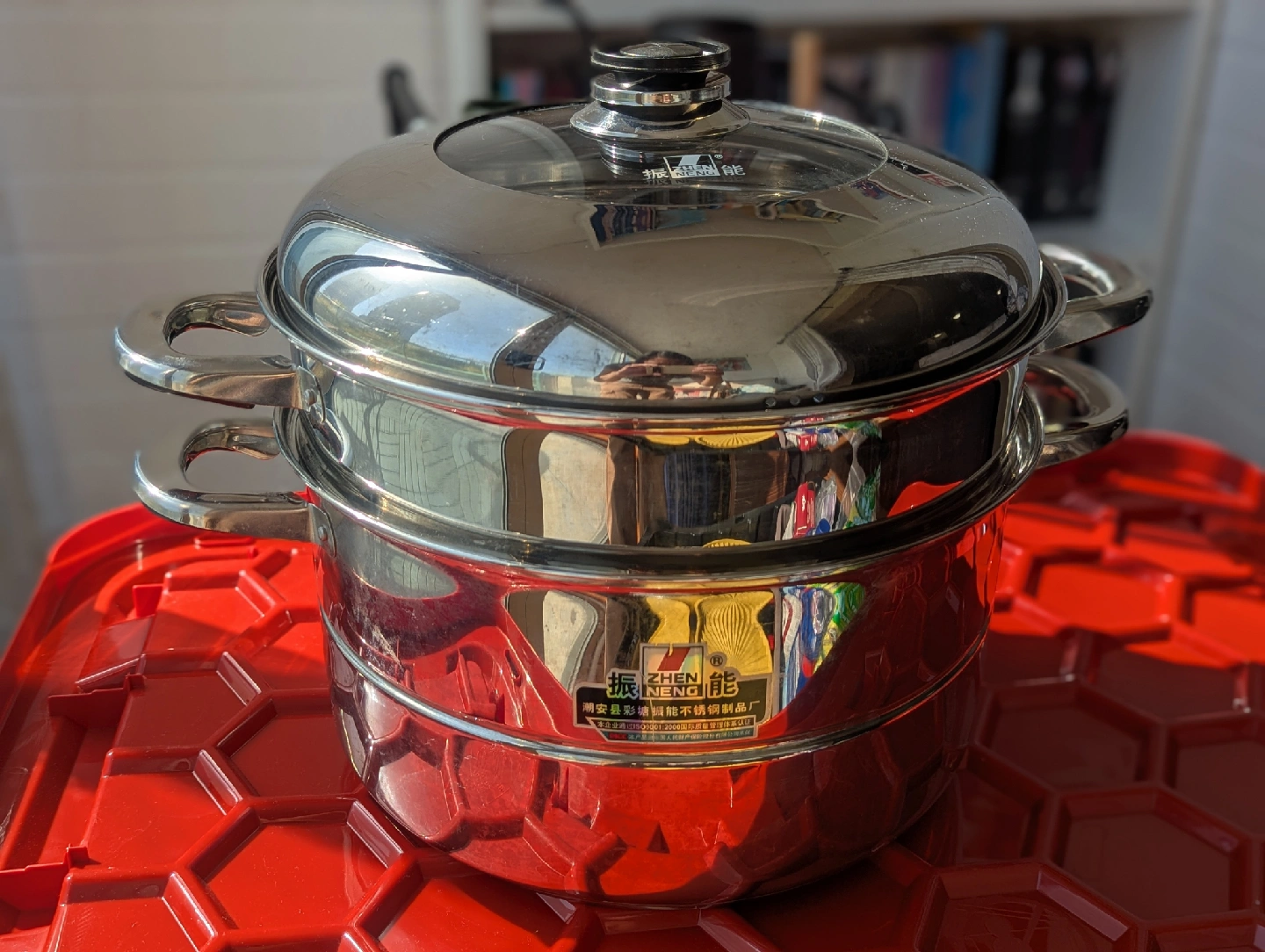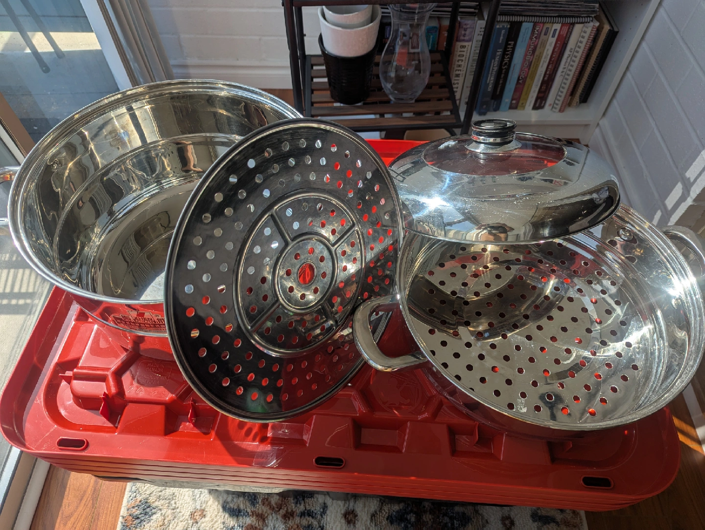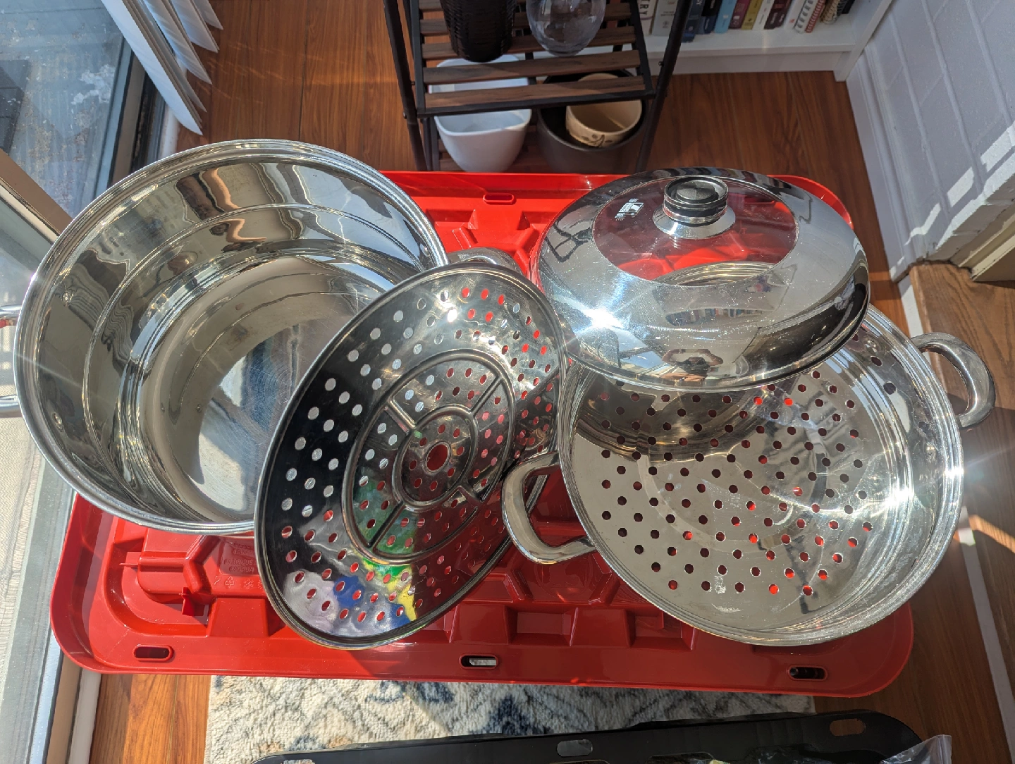 Selling a 2-tier stainless steel steamer pot set (4 pieces). It is in great condition and includes the pots, steamer inserts, and lid.