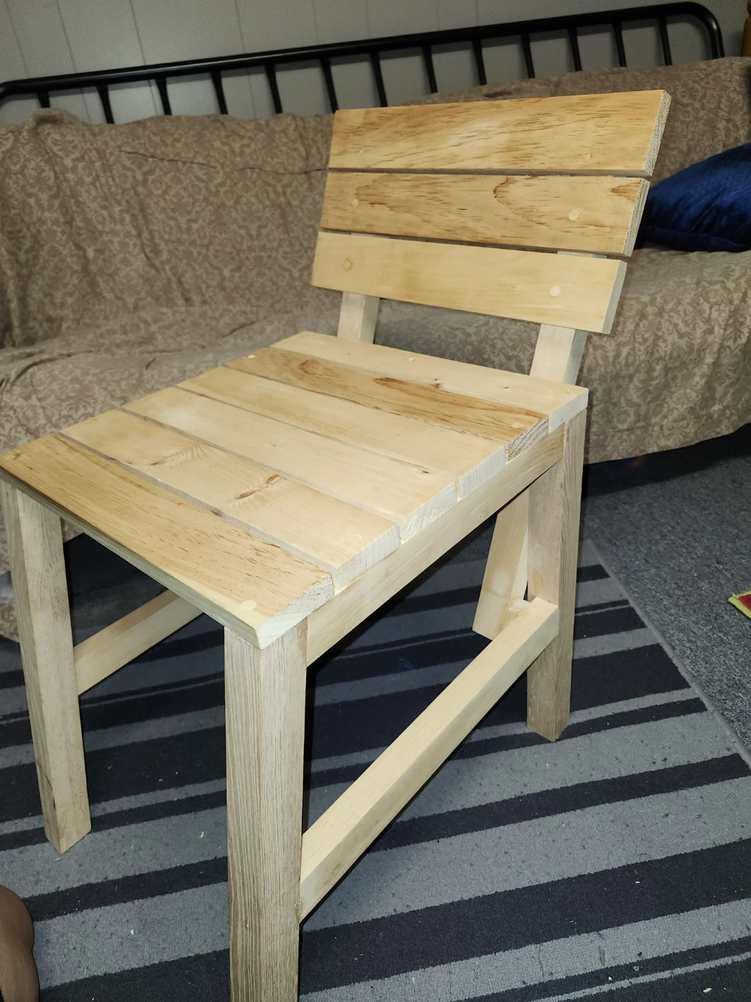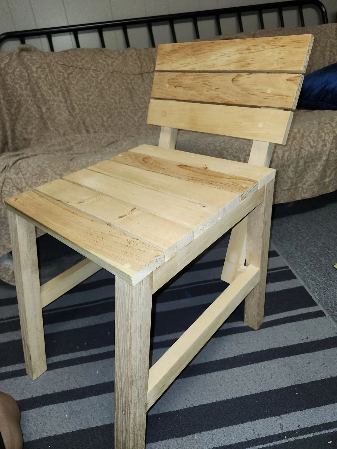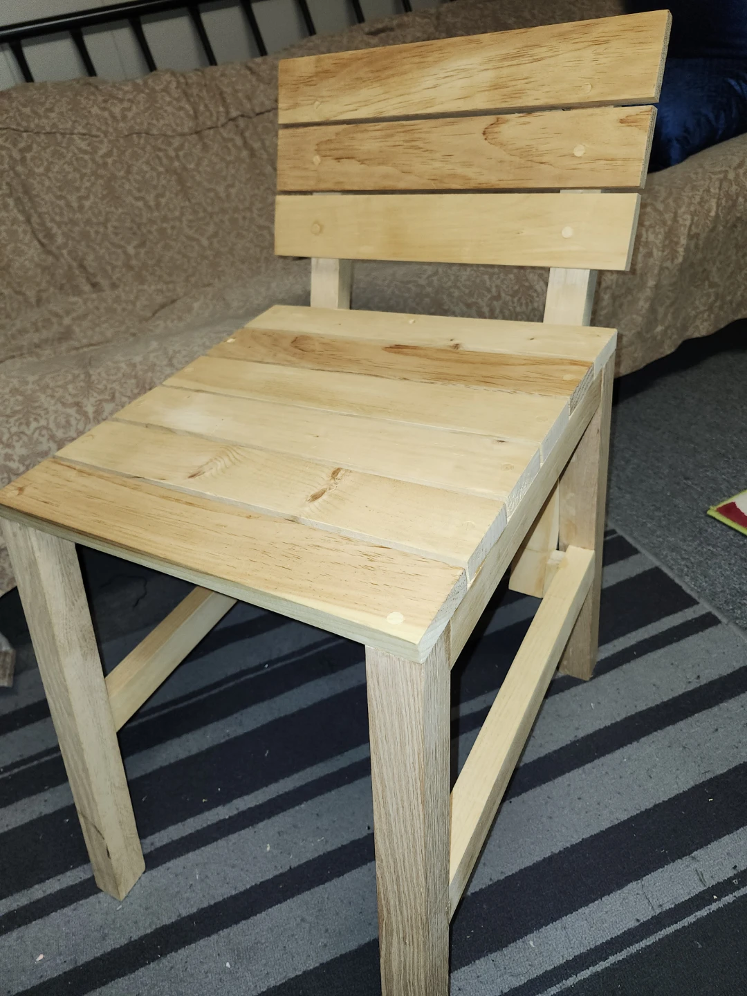 I'm selling a wooden chair. It's a simple, sturdy design, perfect for a small space or as an accent piece. made of light-coloured wood. Also great for patio