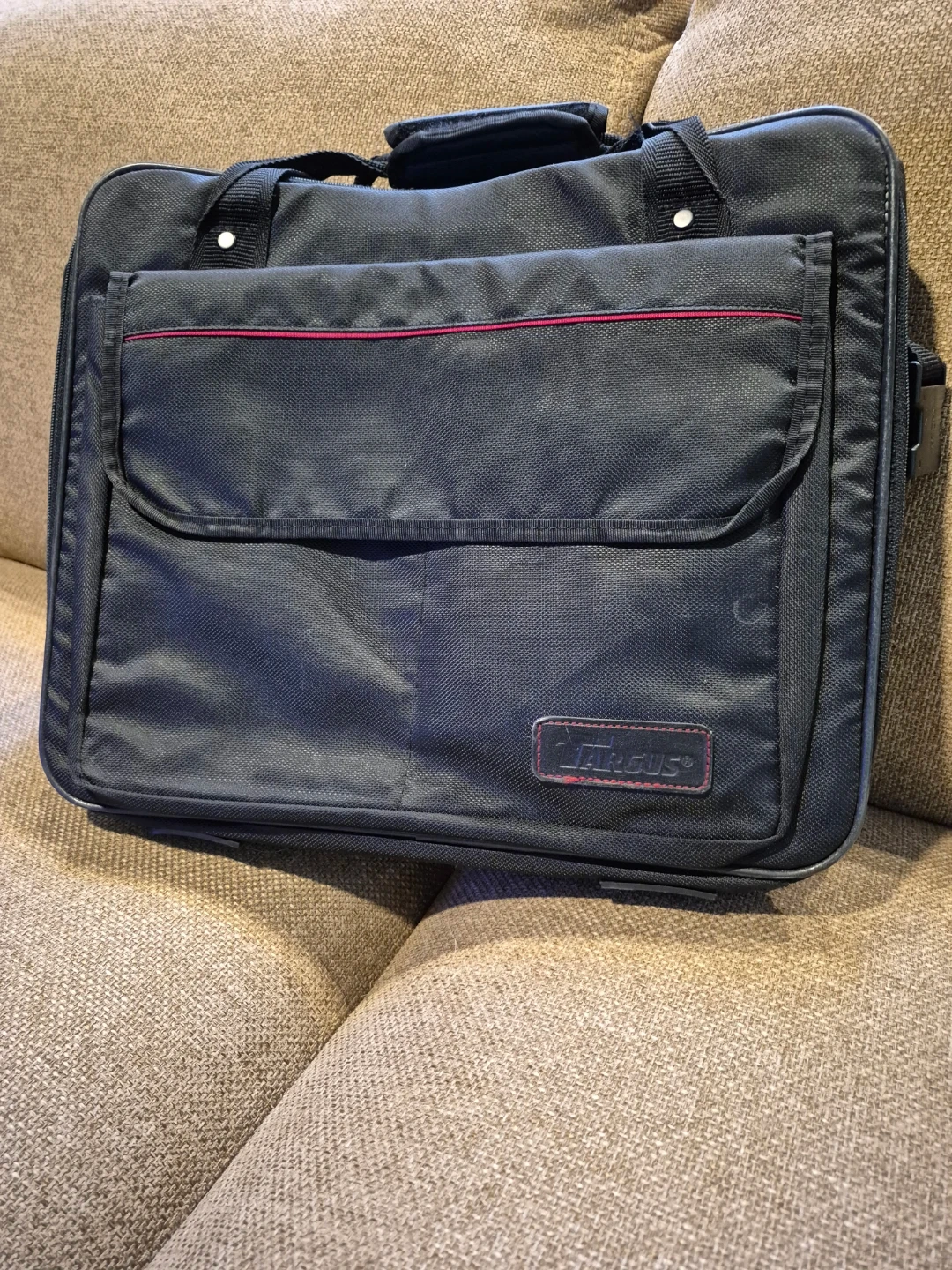 SPECIFICATIONS: Fits laptops up to 14", with Universal Compatibility. Dimensions 13.5" x 15.5" x 3" Black with red stripe.