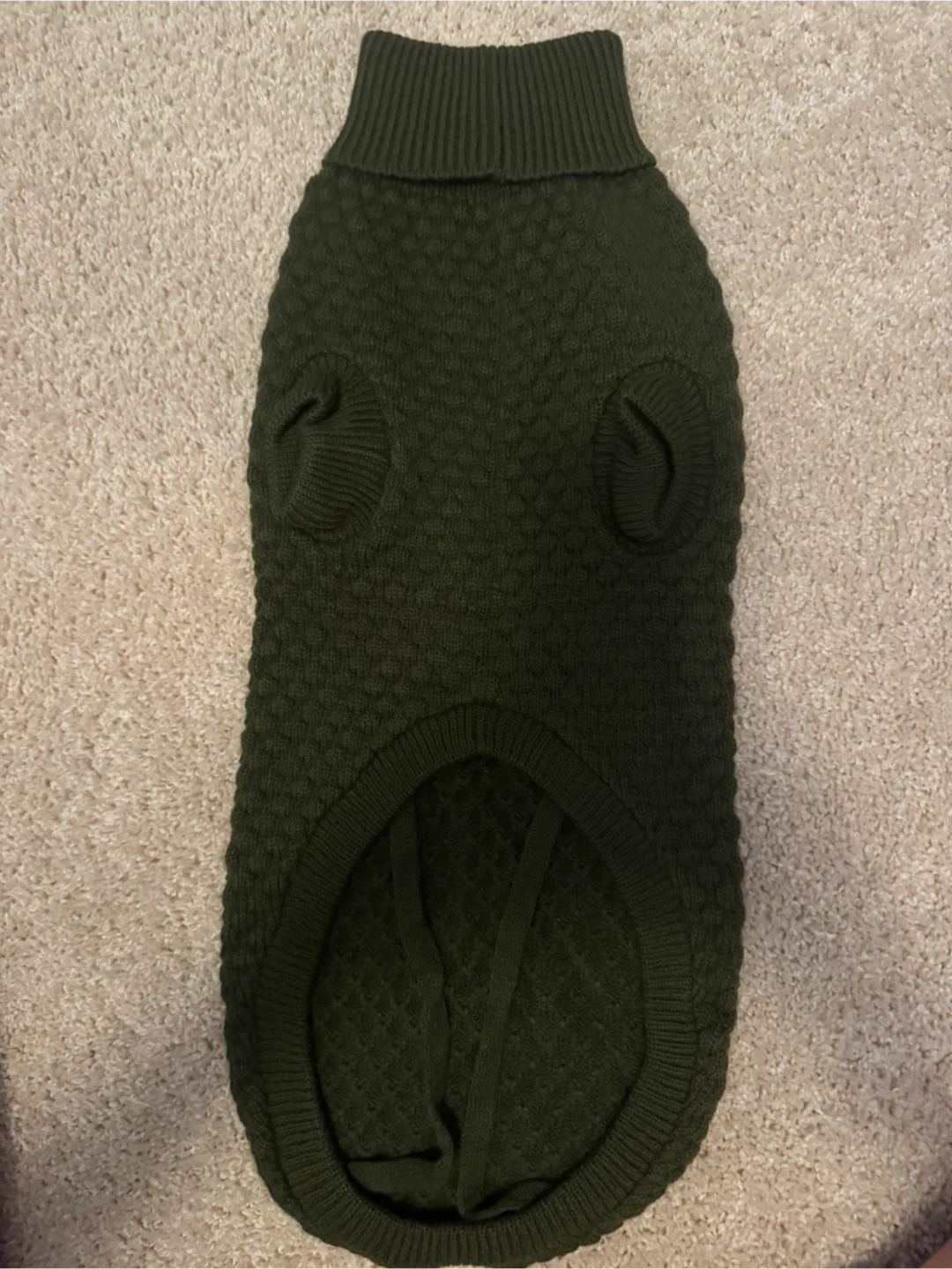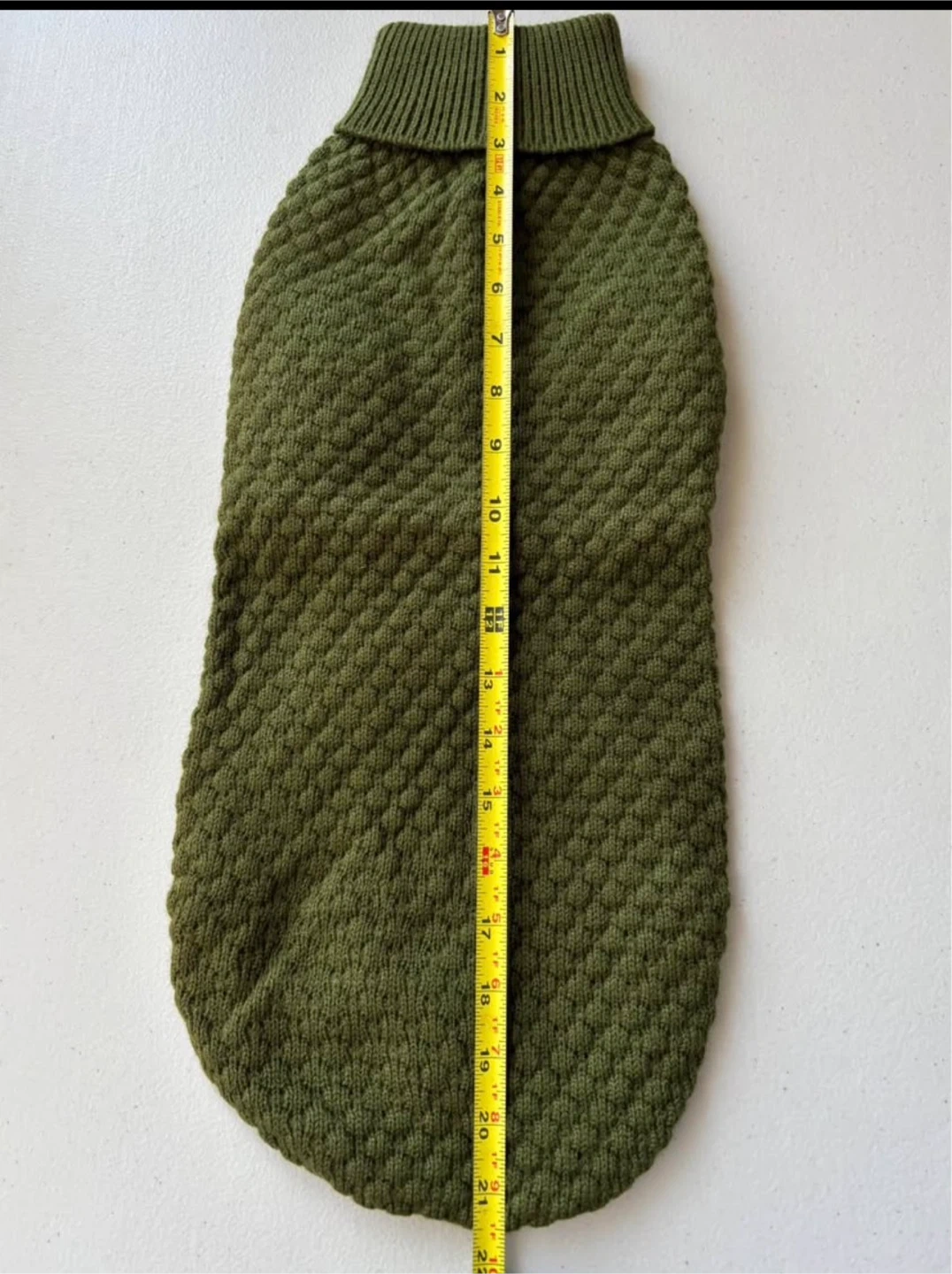 Here's a cozy green dog sweater! It's in great condition and ready to keep your furry friend warm. It's a stylish and practical addition to your pet's wardrobe for those chilly days