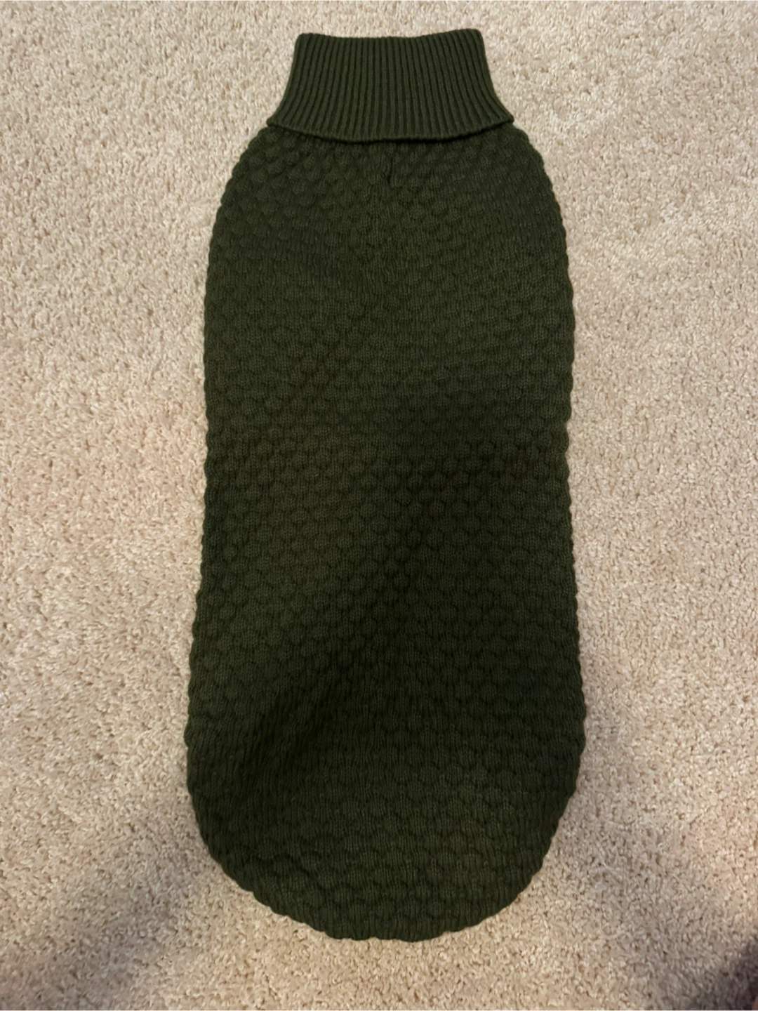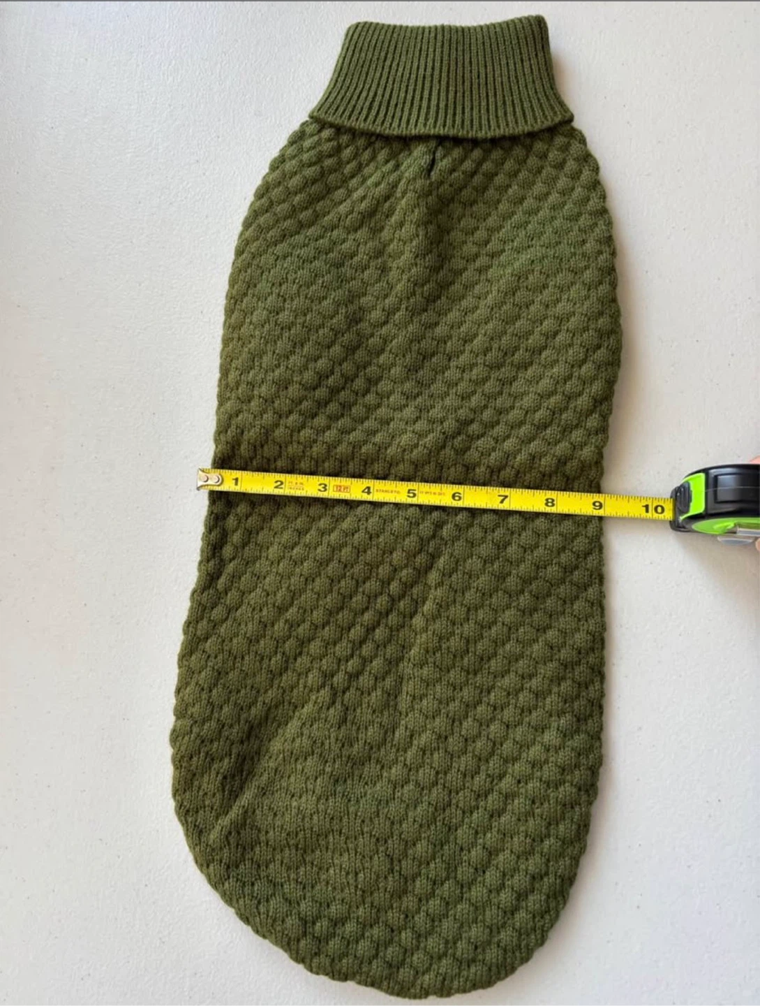 Here's a cozy green dog sweater! It's in great condition and ready to keep your furry friend warm. It's a stylish and practical addition to your pet's wardrobe for those chilly days