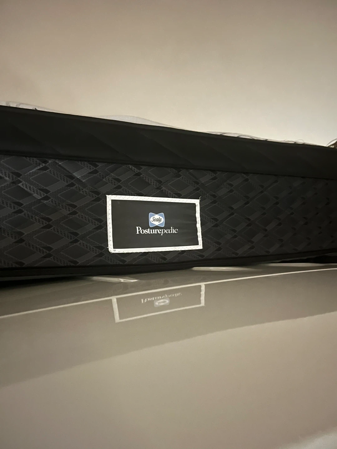 This is a Sealy Posturepedic mattress. It features a diamond patterned fabric on the sides and a quilted top. It's a comfortable mattress for a good night's sleep.