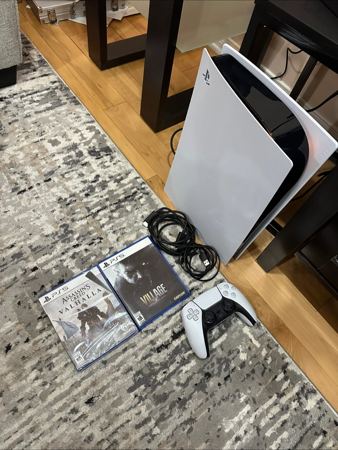Original PS5 disk console in excellent condition, only selling because I play on PC!! Comes with Power cable, HDMI, controller charging cable, 1 controller and 2 games : Assassins Creed Valhalla + Resident Evil Village !! Willing to Trade for Asus Rog Ally , Lenovo Legion Go or Mac Mini