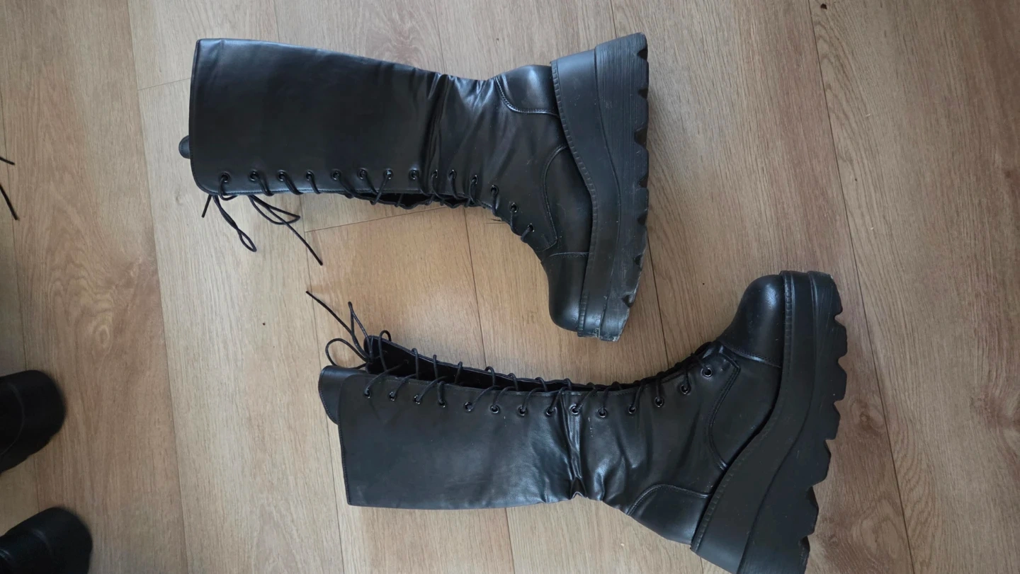 These black platform lace-up boots are in a size 43. They have a chunky sole and full lacing up the front. These boots are made of faux leather.