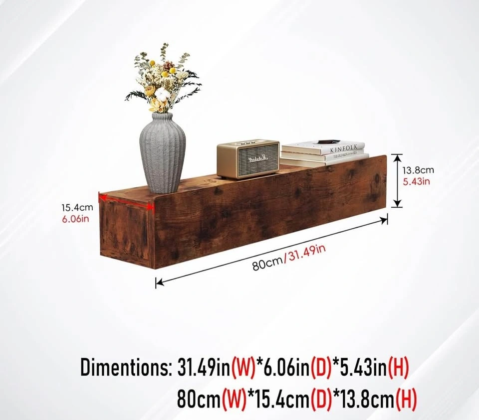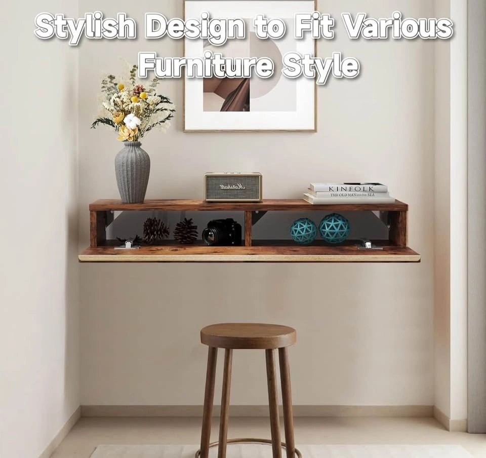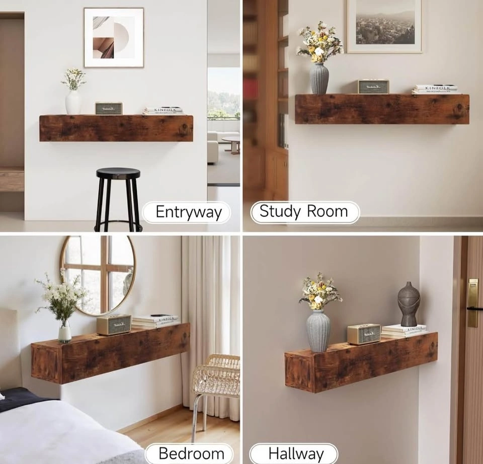 Brand new floating solid wood console table in rustic brown. Wall-mounted narrow design with storage shelf. Perfect for entryway, hallway, or behind couch.