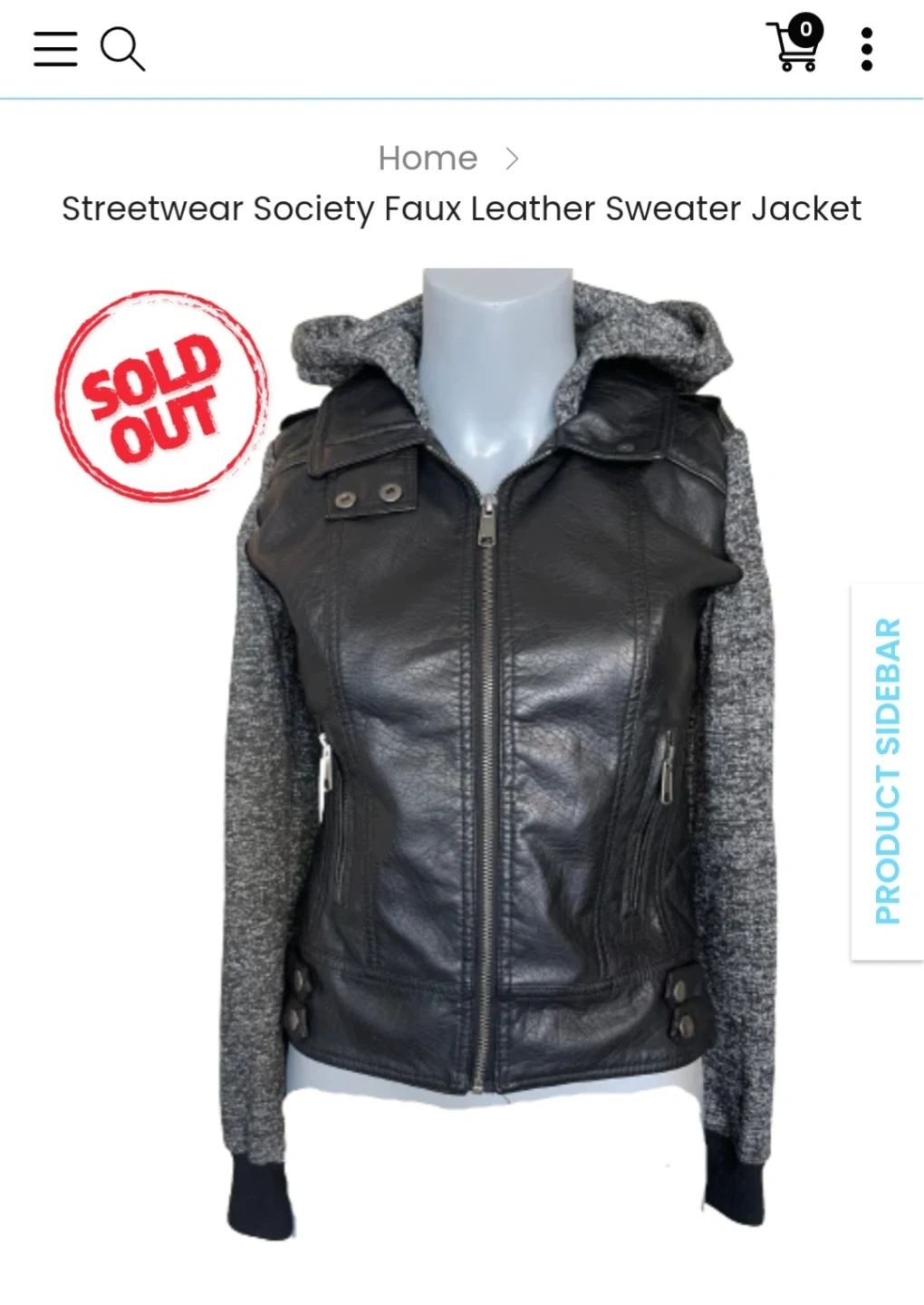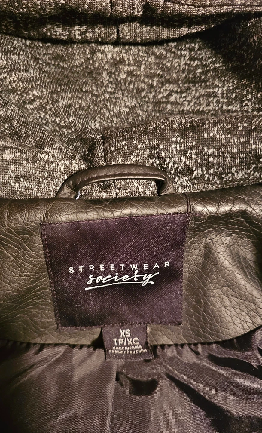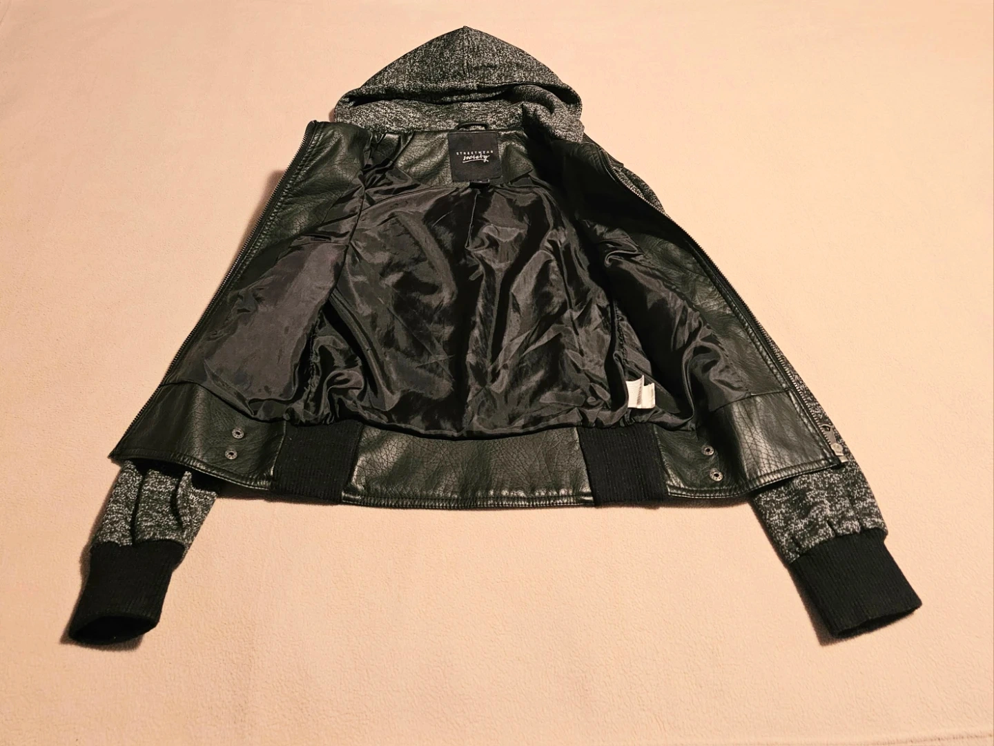 FREE! New Streetwear Society jacket in size XS (chest 78cm). It features a faux leather black body with grey knit sleeves and hood not detachable. It's in great condition and ready for a new owner! Never Worn No Tag