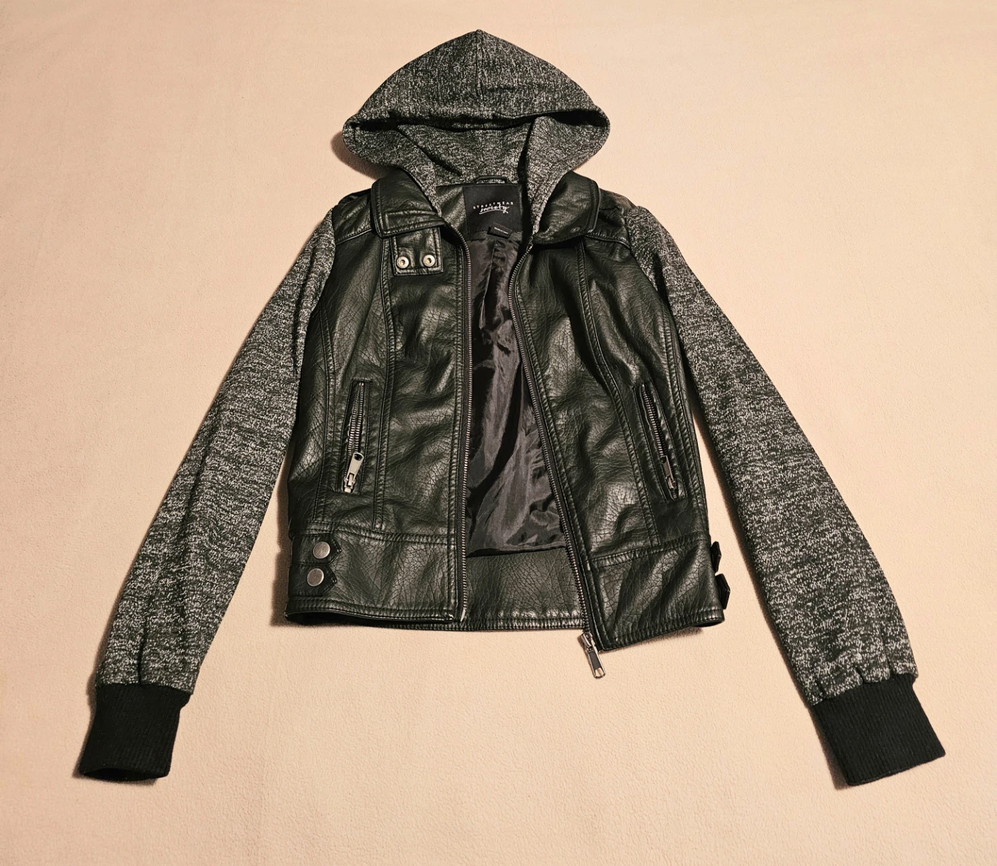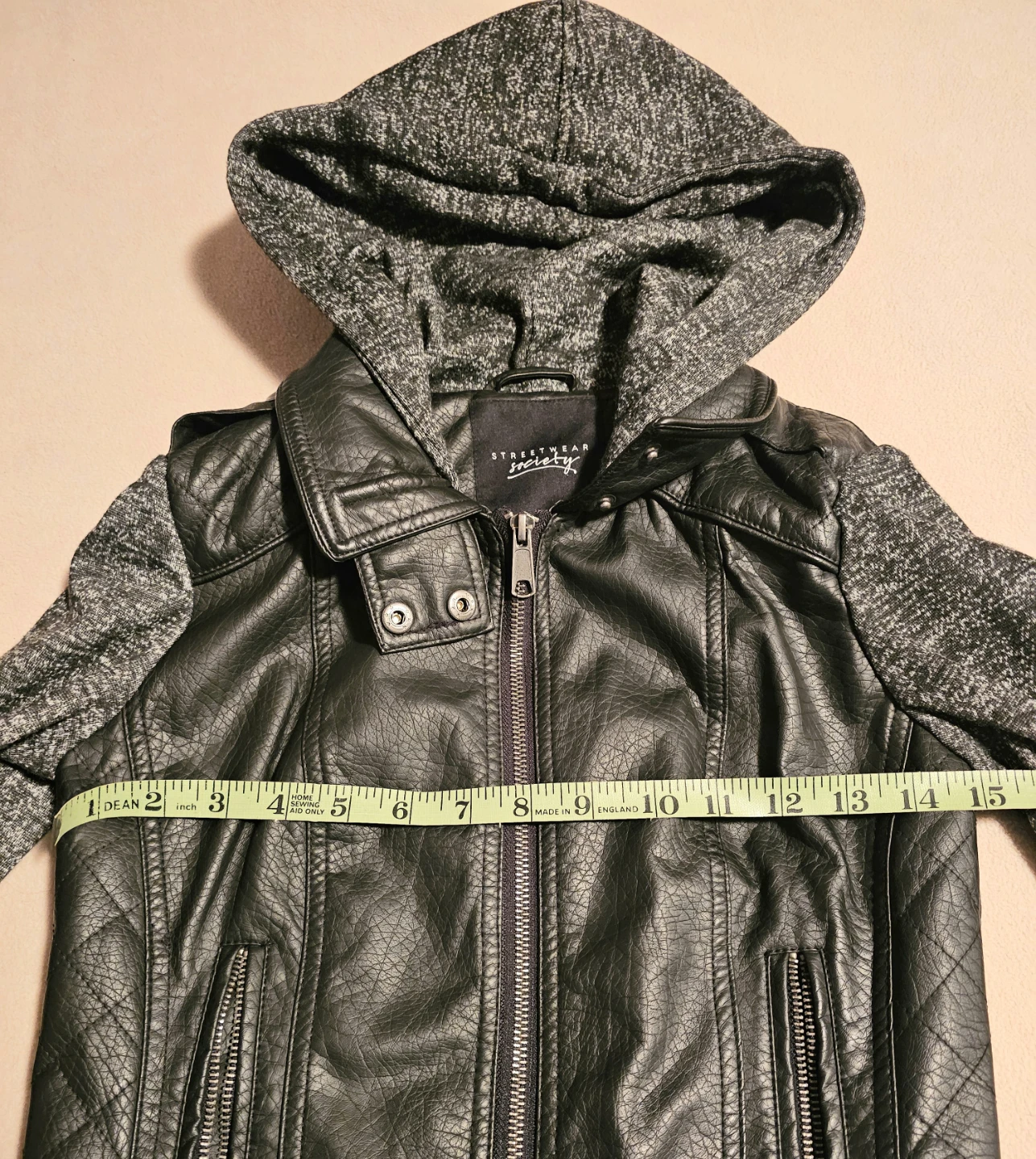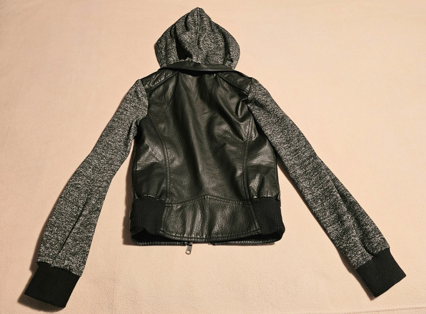 FREE! New Streetwear Society jacket in size XS (chest 78cm). It features a faux leather black body with grey knit sleeves and hood not detachable. It's in great condition and ready for a new owner! Never Worn No Tag