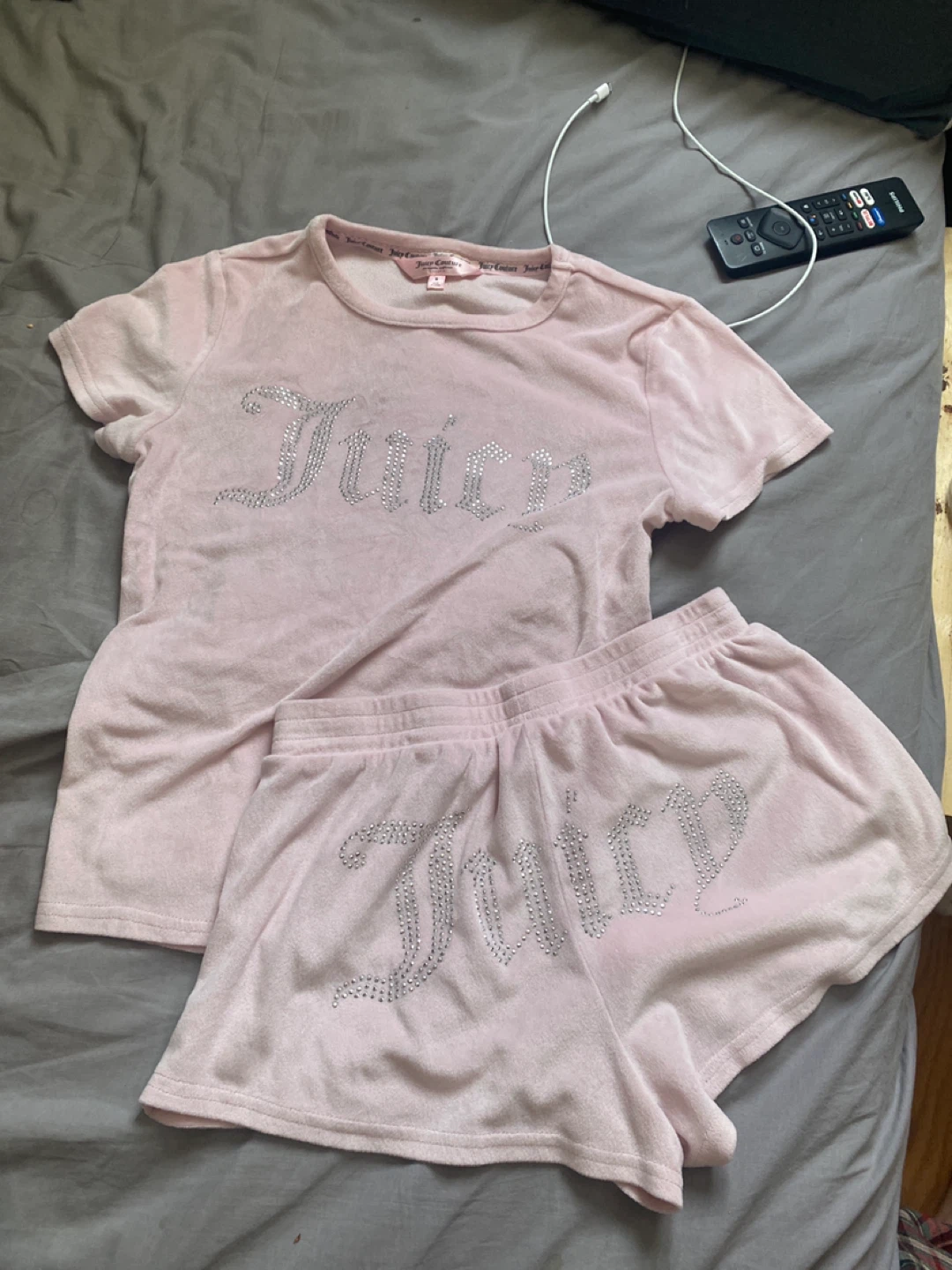 This pink velour pyjama set features the Juicy Couture logo with diamante detailing. It includes a short-sleeved top and matching shorts. Super comfy for lounging!