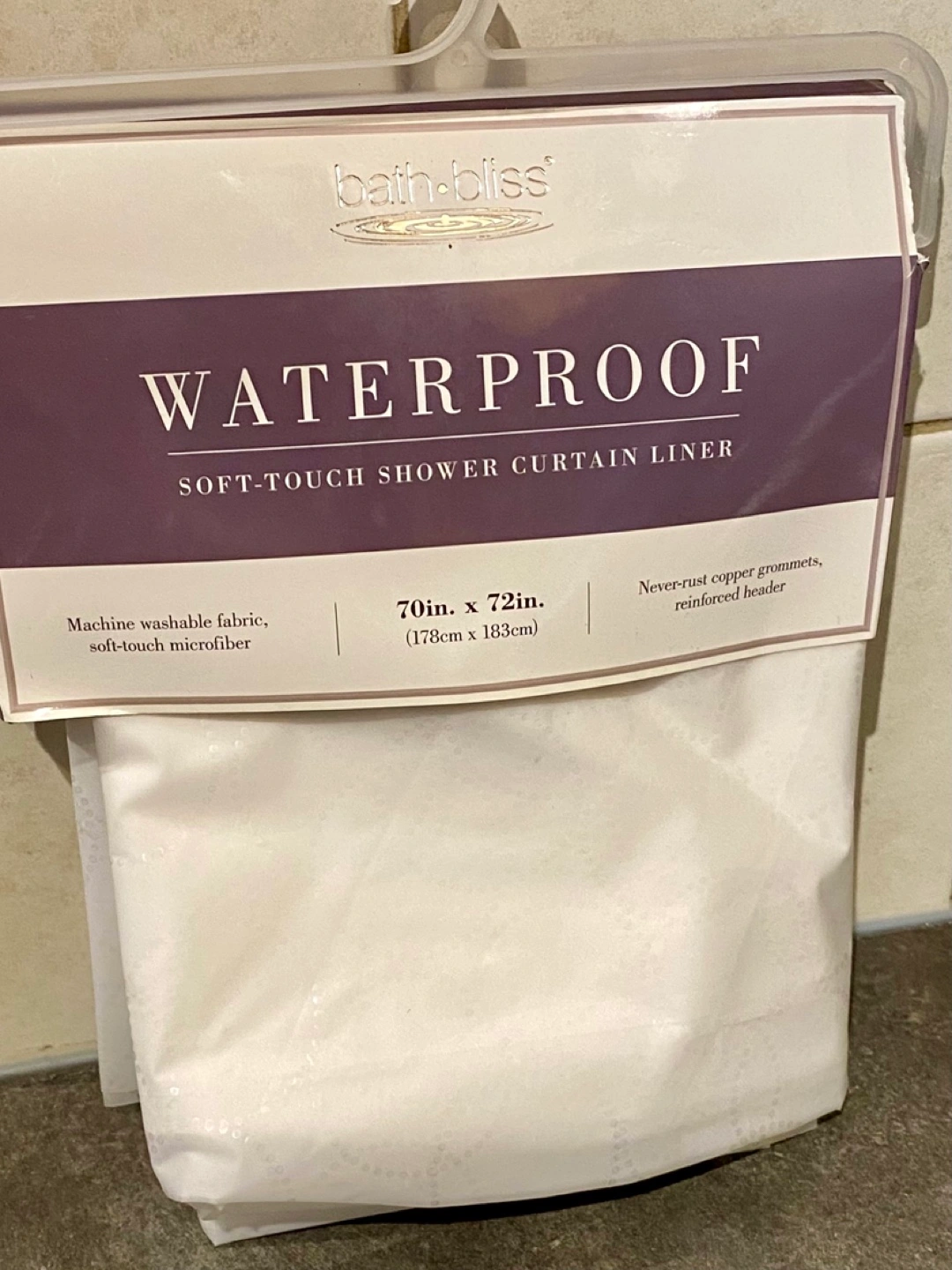 This is a brand new Bath Bliss waterproof, soft-touch shower curtain liner.